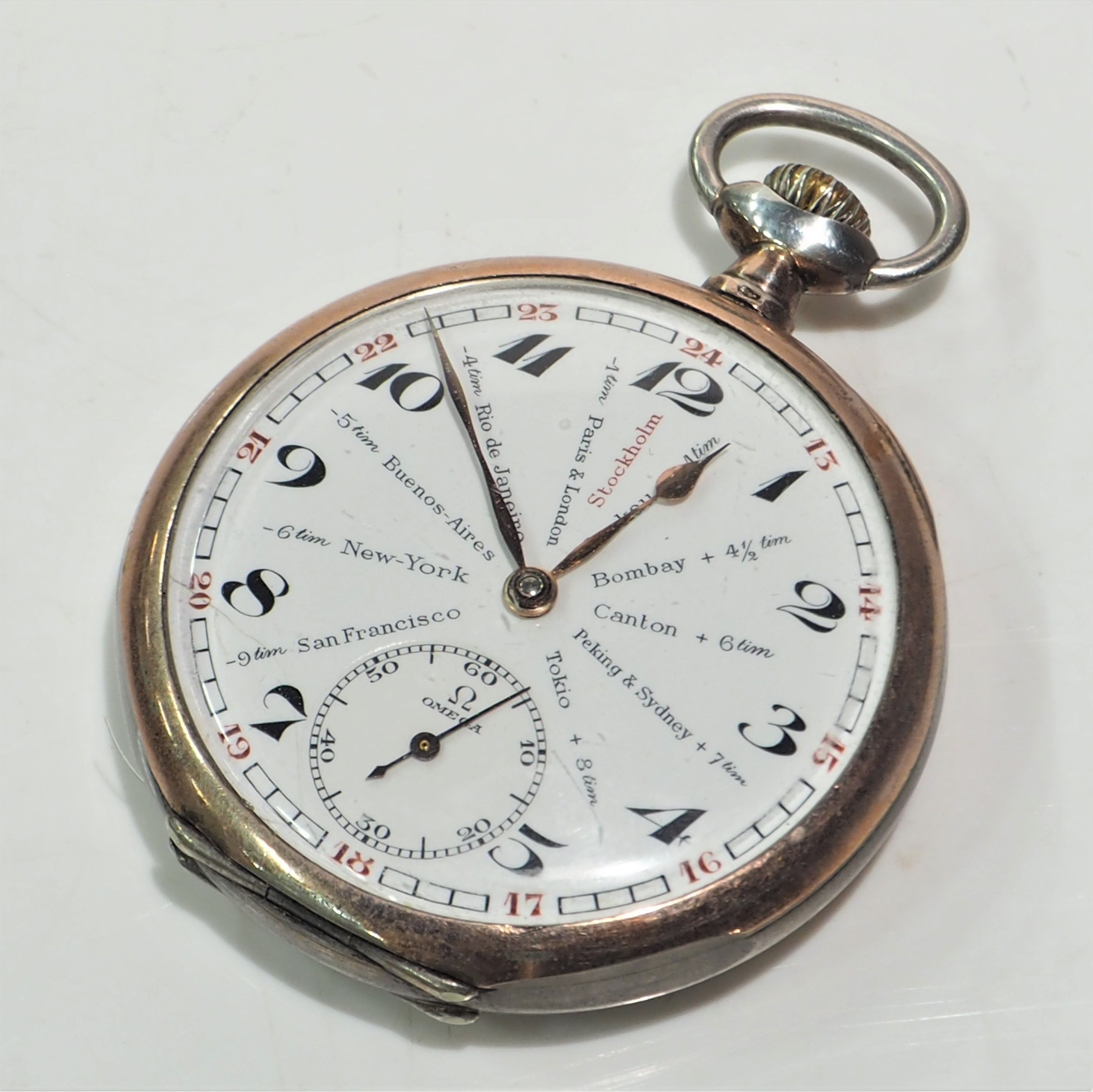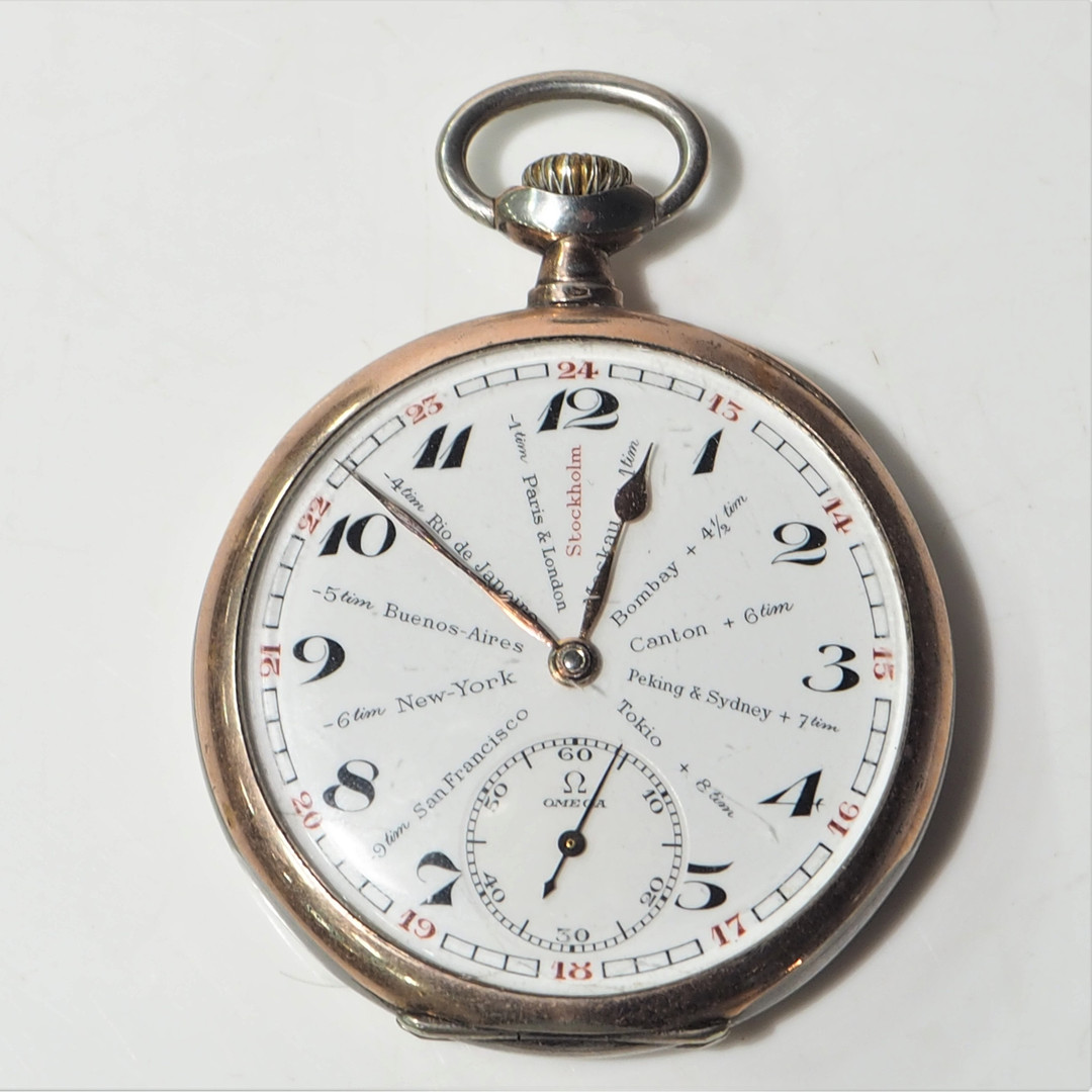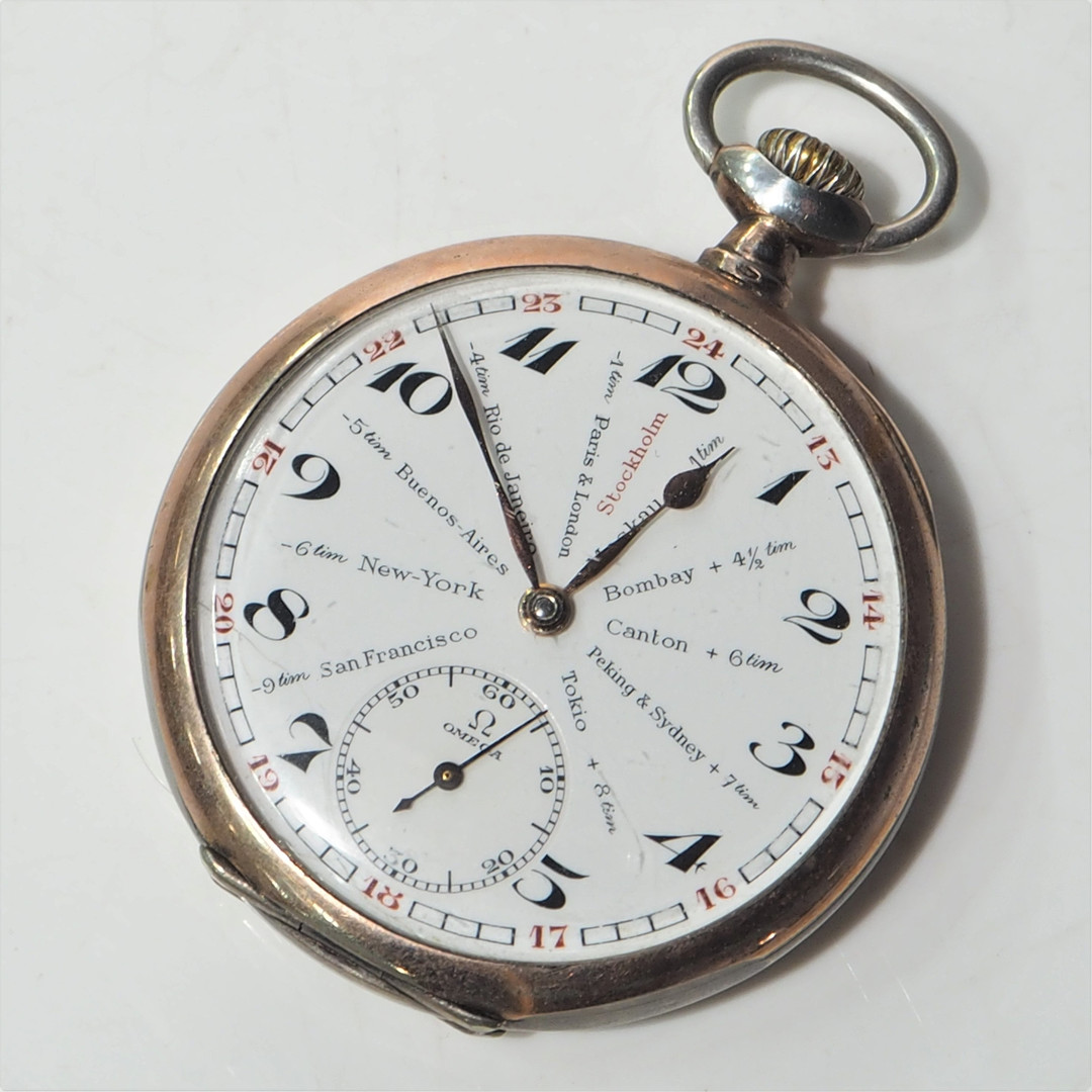 2400862. TASCHENUHR, Silber, Omega mit Weltzeit.