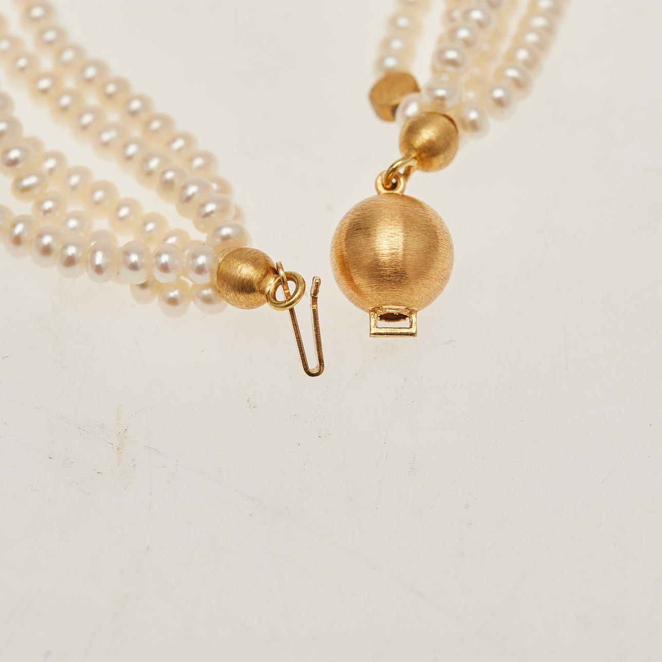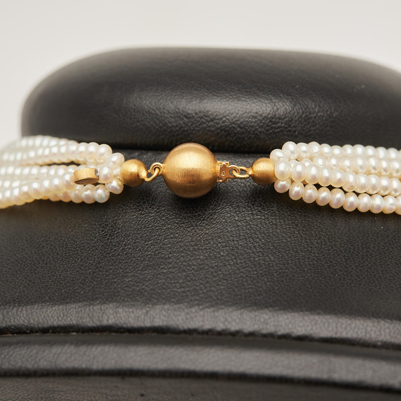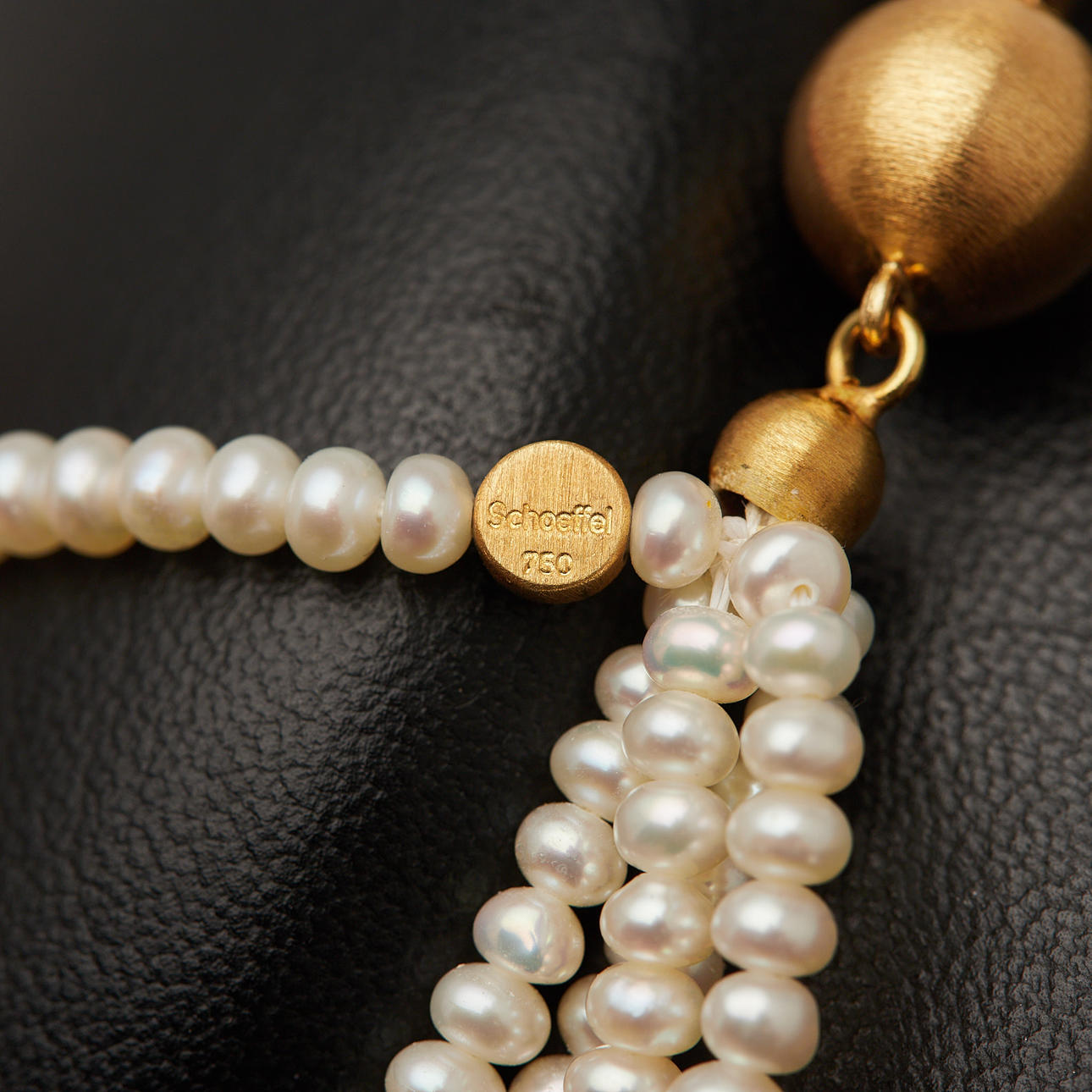 Schoeffel, Fünfsträngige Kette mit Perlenbesatz, mit einem Verschluss gefertigt aus 750er Gelbgold, L.42cm, B.17,3mm, am Verschluss gestempelt und mit Herstellerbezeichnung versehen, Legierung geprüft, Gewicht: 36,1g.