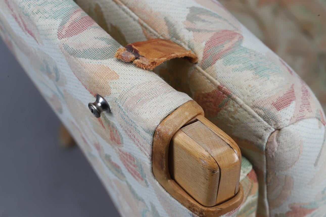 Rahmen im Buch. Bezug aus Stoff mit Blumenmuster, gestempelt Bruno Mathsson Dux, Sitzhöhe ca. 34-40 cm.