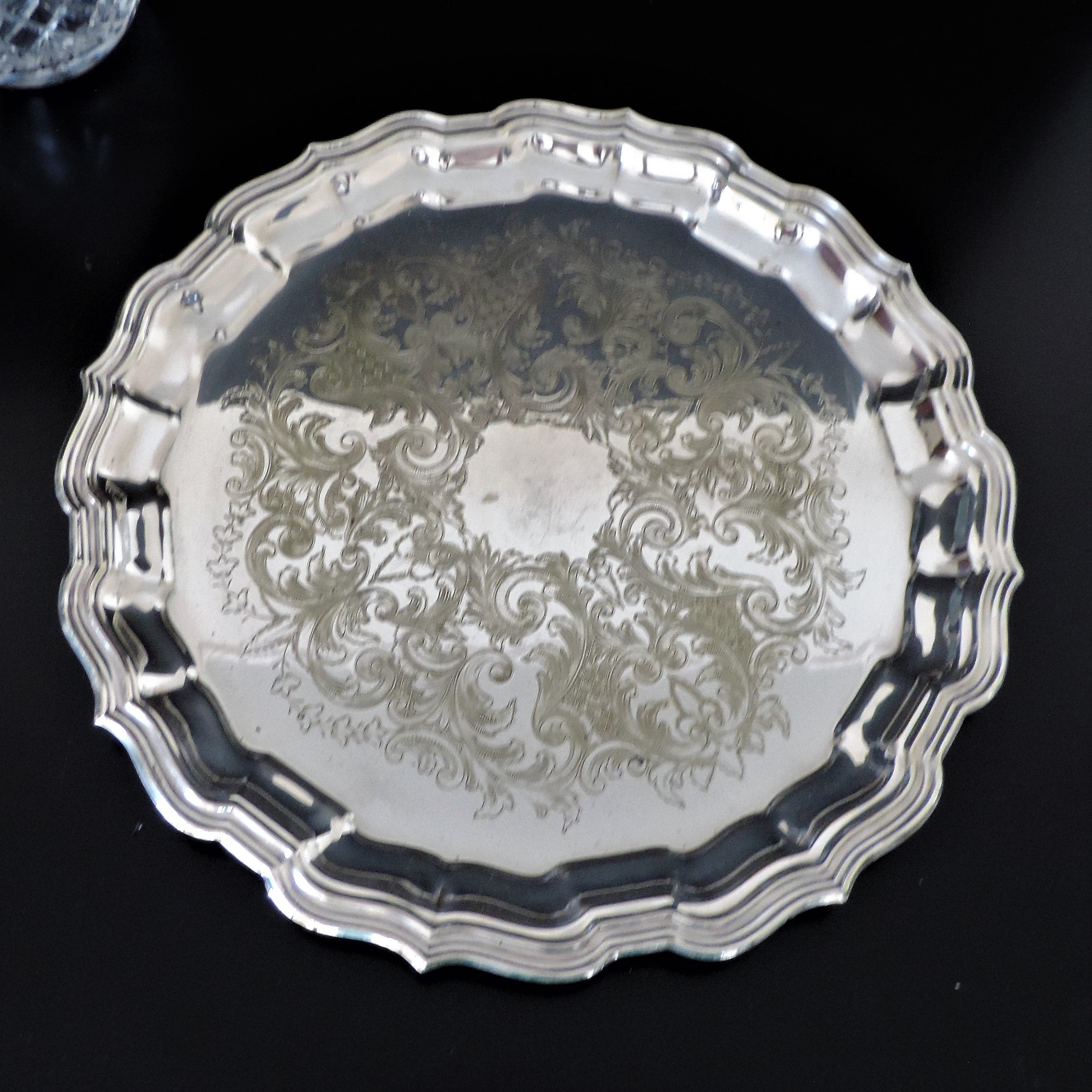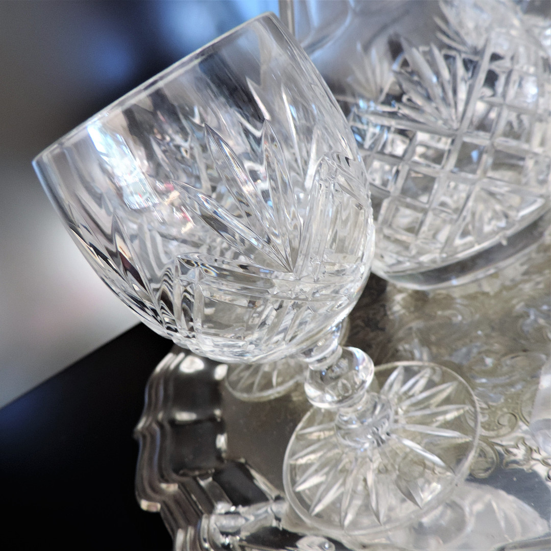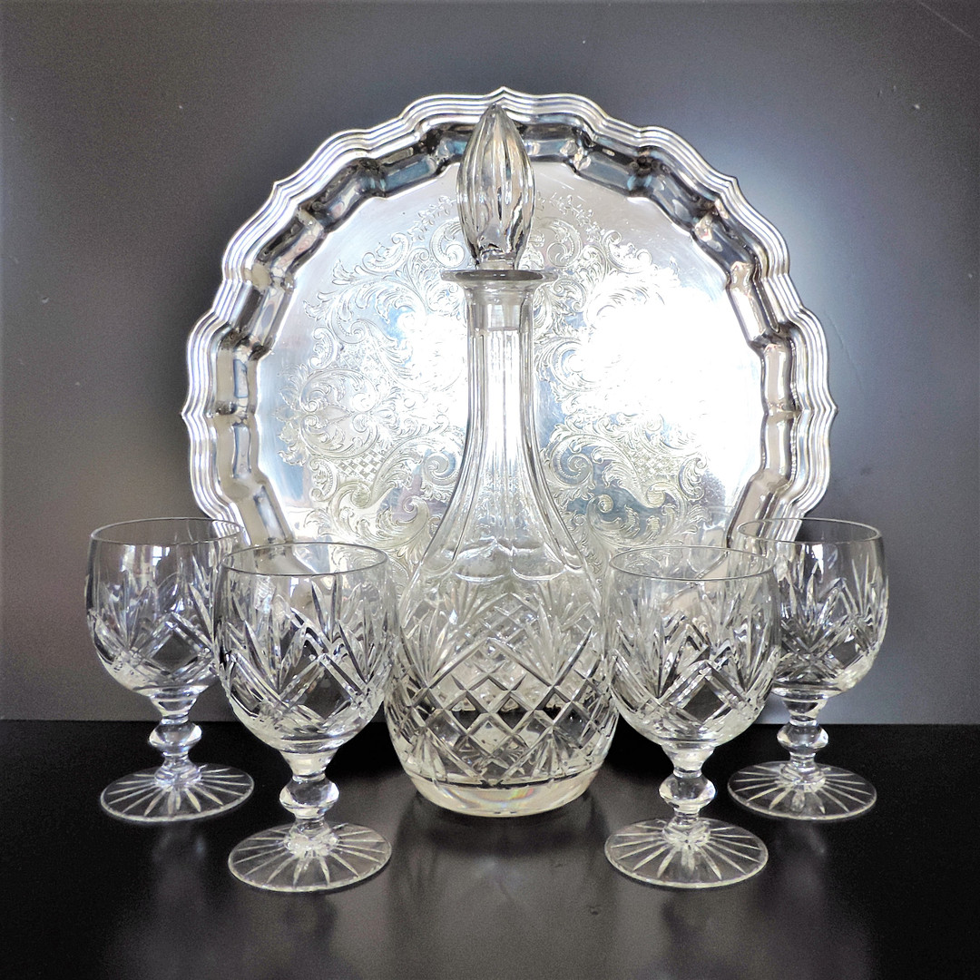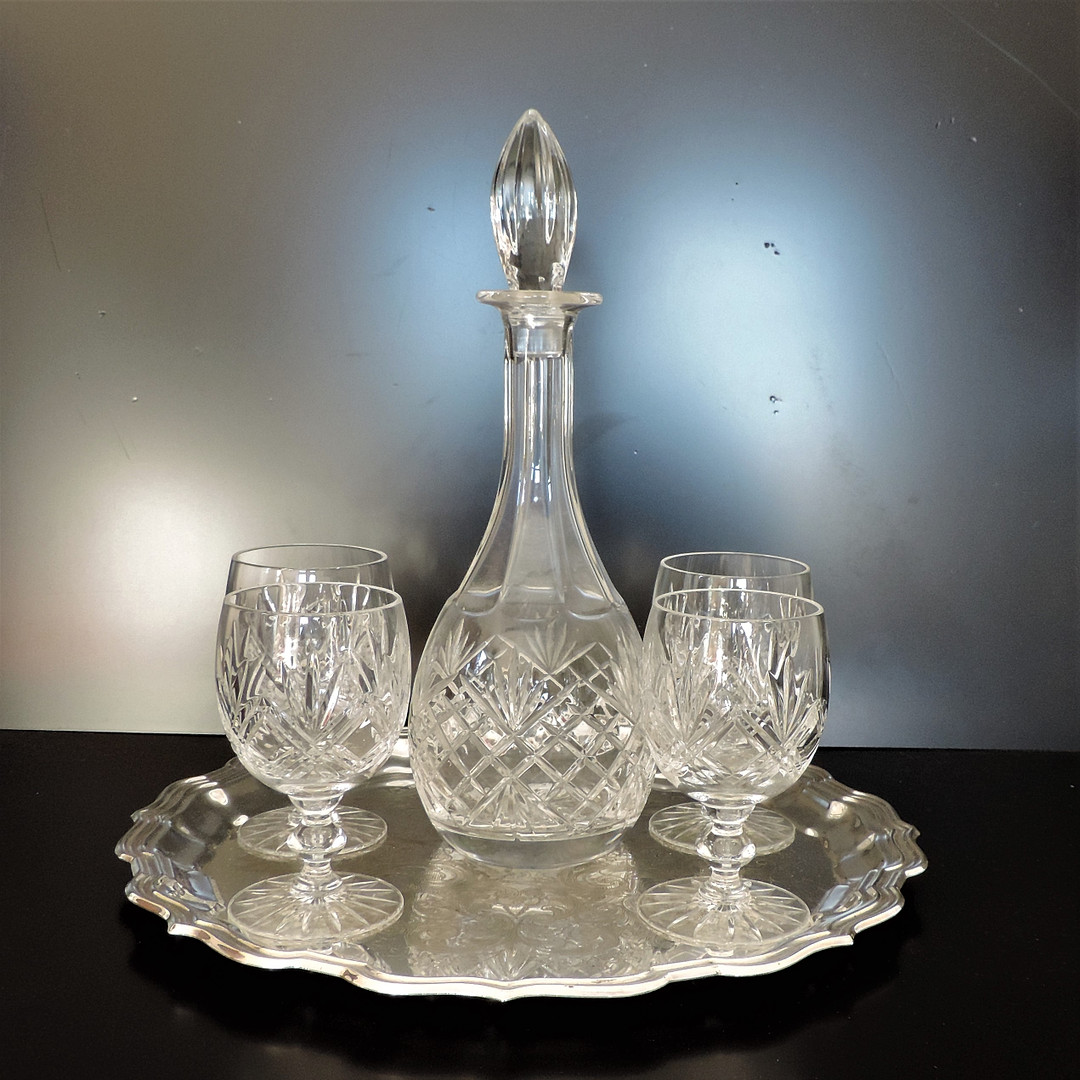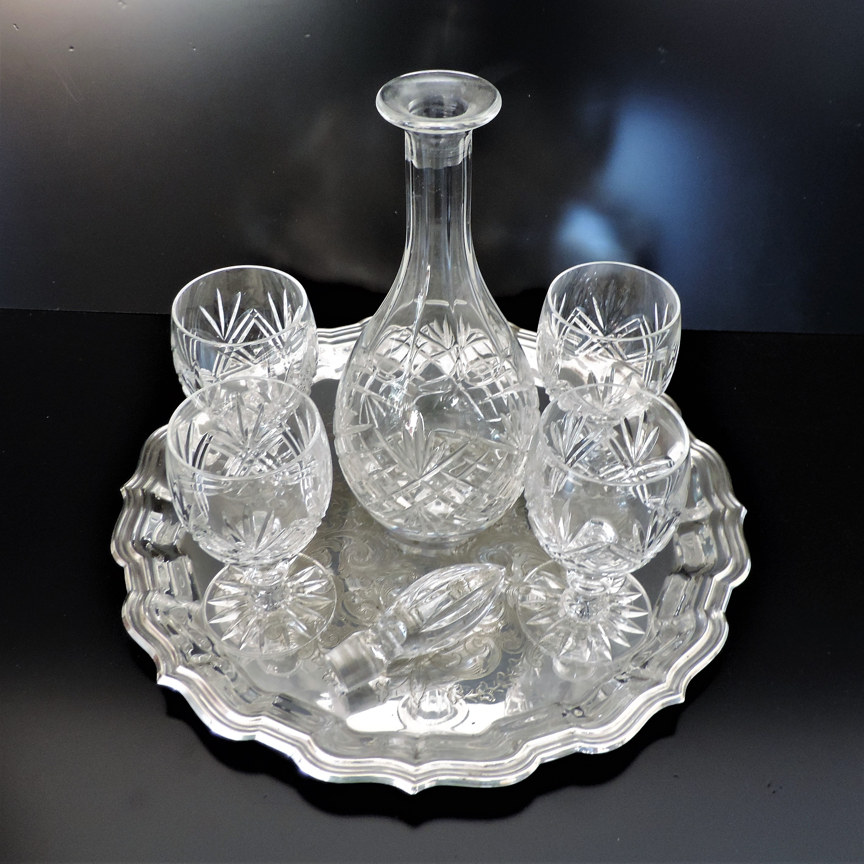 2408267. DEKANTER AUS KRISTALL & WEINKELCHE AUF VERSILBERTEM SERVIERTABLETT.