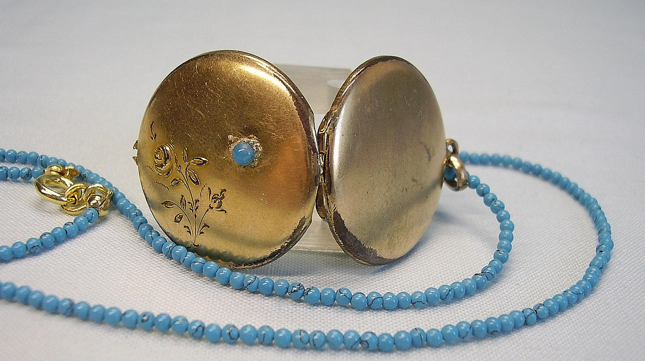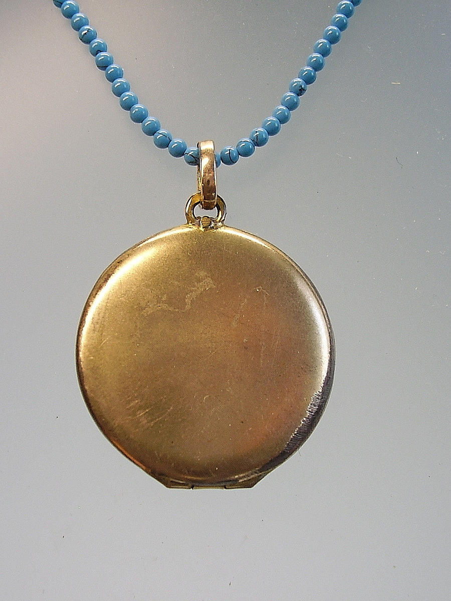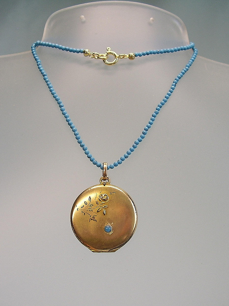 Es kann geöffnet werden und bietet Platz für Photos. Die Schauseite ist floral gestaltet und mit einem türkisfarbenen Pastenglas-Cabochon besetzt.