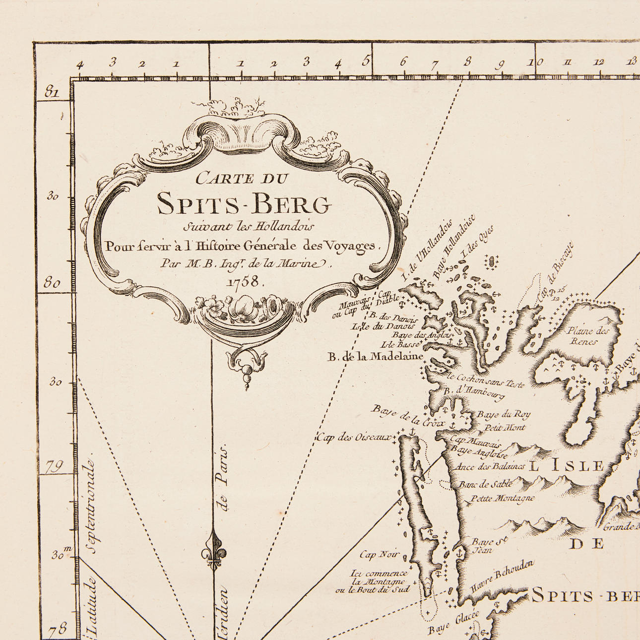 SPETSBERGEN, 2 gestochene Karten: Carte von Spitz Bergen (aus Page Reisen), ca. 285x270 mm.; BELLIN, J. Carte du Spits-Berg suivant les Hollandois. Paris 1758, ca. 230x320 mm. 2 Stk.