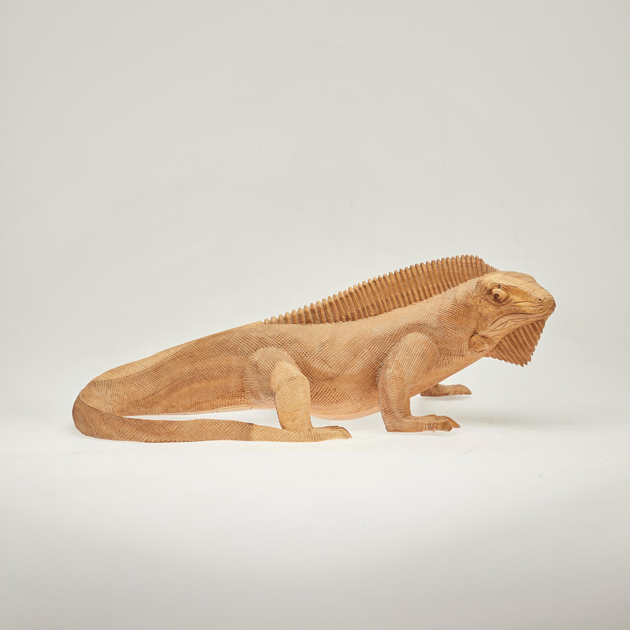 Skulptur / Figur, Komodowaran, Holz. Figur aus geschnitztem und reliefiertem Holz mit der Darstellung eines Komodowarans, H.24cm, L.70cm, B.52cm.