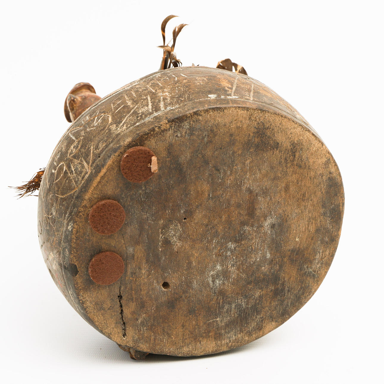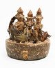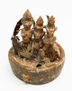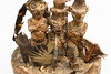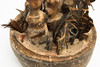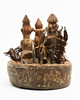 Yaka Fetisch Objekt. Zaire. Holz, geschnitzt, Federn, Horn, Metall, Muscheln, u.a. Drei größere und eine kleinere Figurine, mit lehmähnlichen Material montiert in einer zylindrischen geschnitzten Schale mit ornamentalem und figurativem Dekor. H. 22 cm, D. 19 cm.