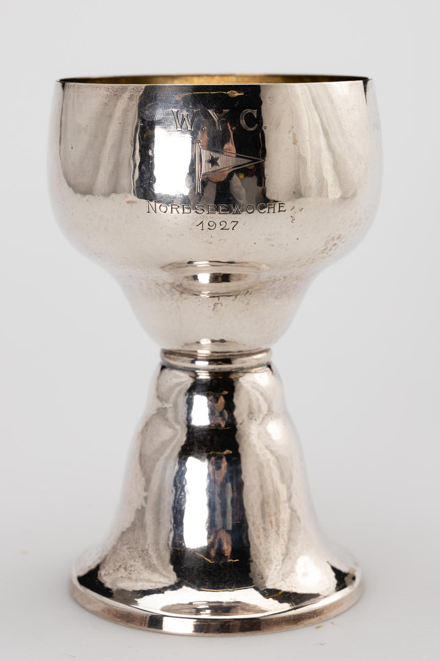 830er Silber, getrieben und gedrückt. Konisch hoch aufsteigender Fuß mit doppelkonischen Kuppaansatz. Diese bonbiert auslaufend. Darauf in Gravur der Titel der Segelragatta vor Helgolland "Nordseewoche 1927". Martellierte Oberfläche. Innenvergoldung. HxDm: 16,7 x 10 cm, ca. 215 g. Silberstempel mit Halbmond und Krone, Herstellermonogramm.