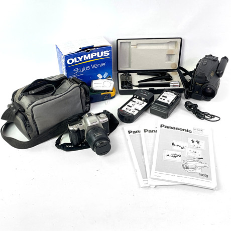 Ein alter Sanyo VM-D6P-Camcorder zusammen mit einem alten Sharp VL-C73-Camcorder mit Gehäuse und Zubehör.