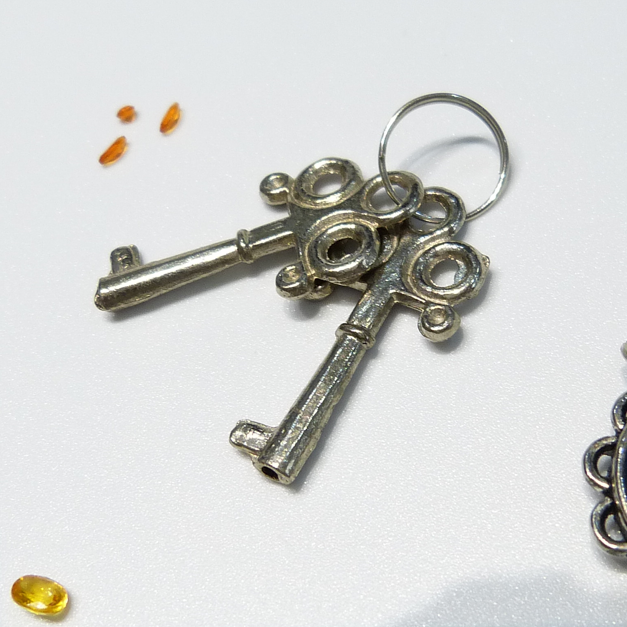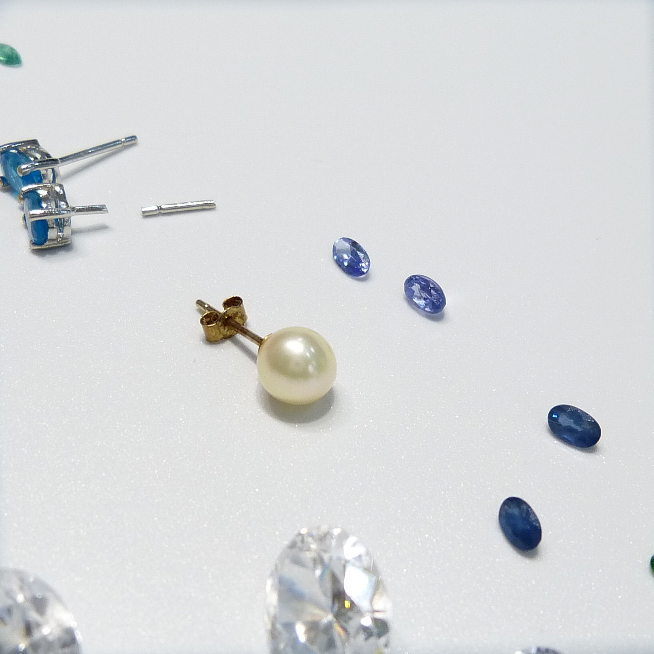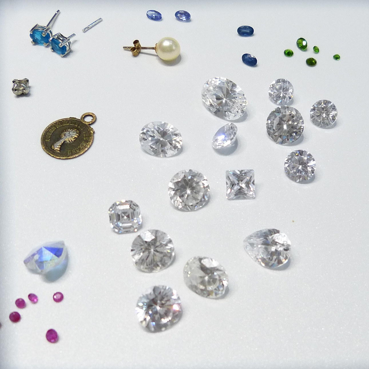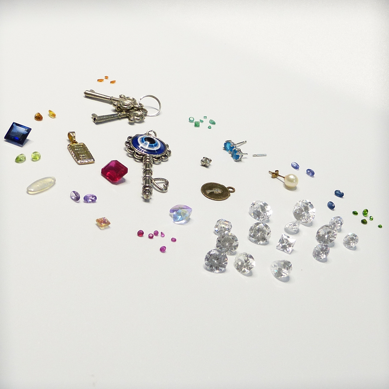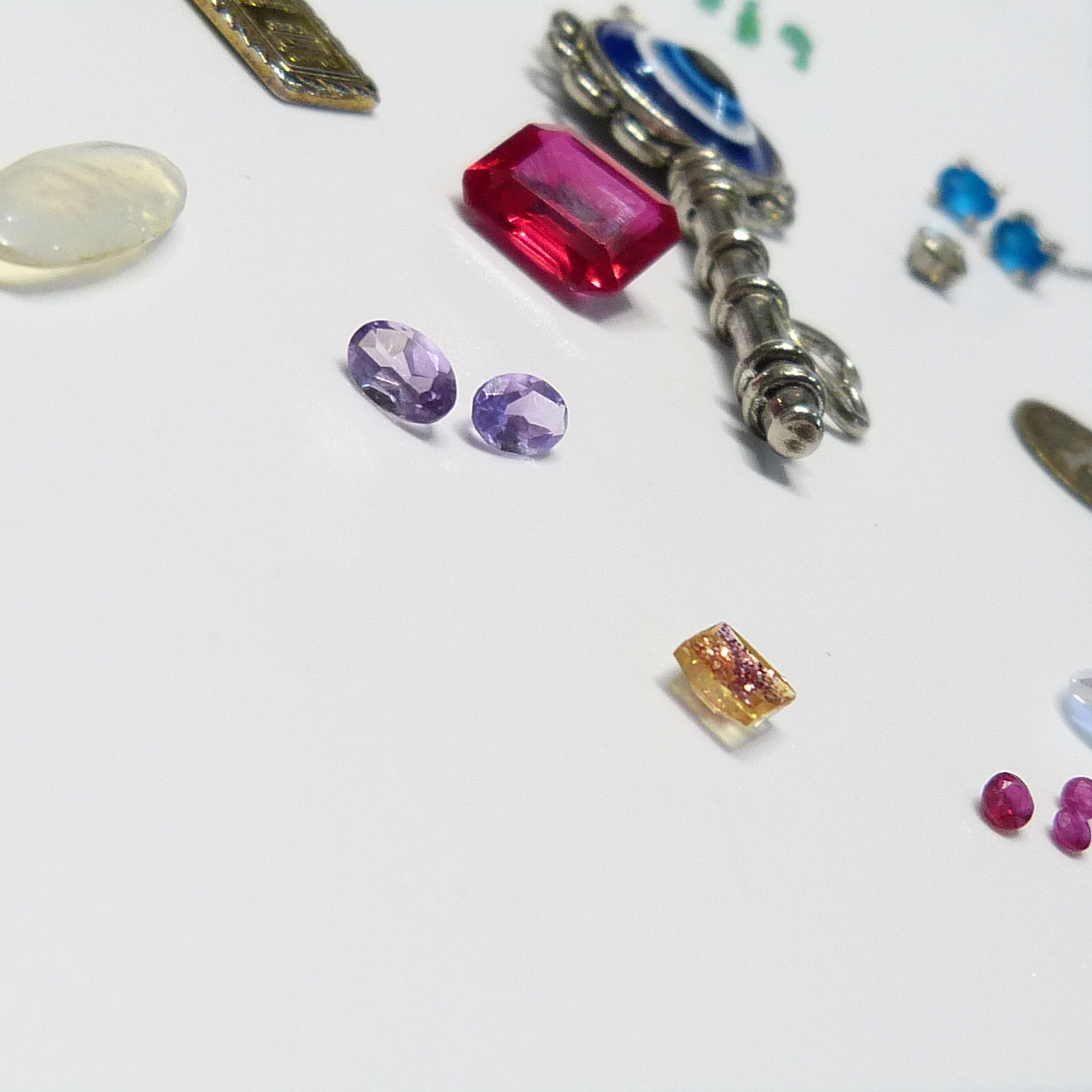 1x Paar silberne Apatit-Ohrstecker (Ein silberner Stiel ist gebrochen.) 1x Anhänger Türkisches Auge 1x Set mit verzierten Schlüsseln 1x Ohrring mit Zuchtperlen aus 9 Karat Gold 1x Anhänger Queen II im Aztekenstil 1x Anhänger Credit Suisse 14x Zirkonia-Steine 2x Amethyst-Steine 2x Orangen-Zitrin-Steine 6x Rubin-Steine 2x Peridot-Steine 2x Tansanit-Steine 2x Saphir-Steine 1x Strass (in Fassung) 1x großer quadratischer blauer Stein 1x großer blauer Stein im Smaragdschliff 3x Feueropale 6x Smaragdsteine 3x ungerade lose Steine 5x Turmalinsteine Gesamtgewicht : 31,9 g.