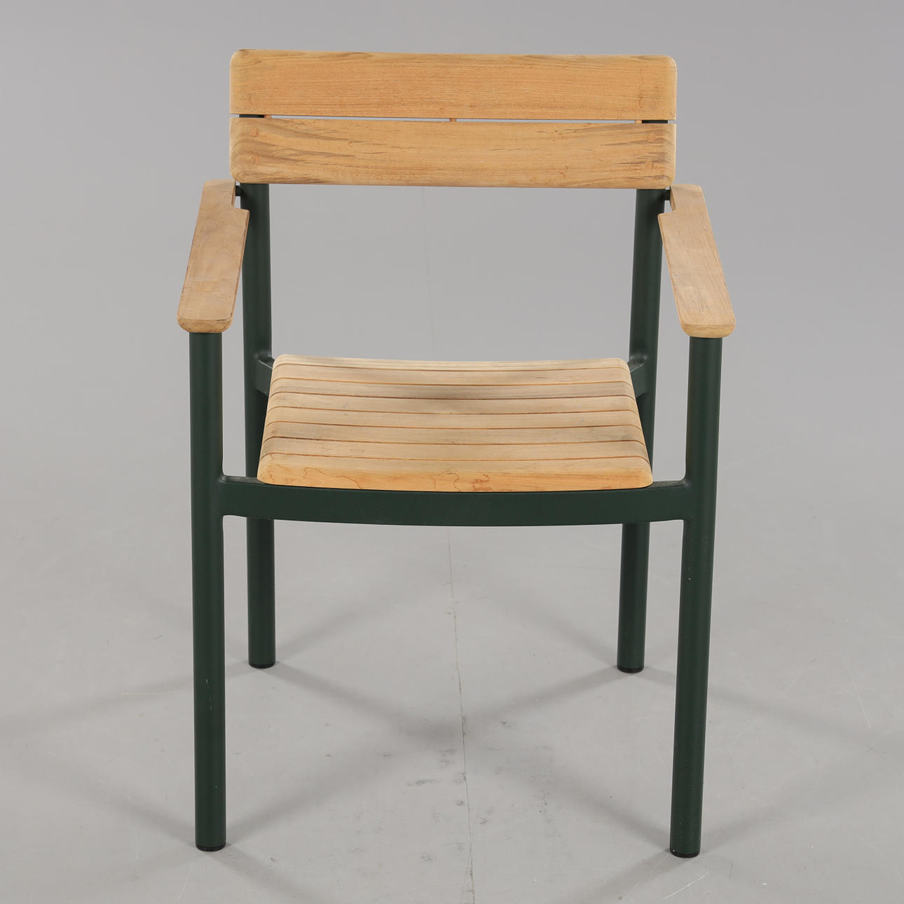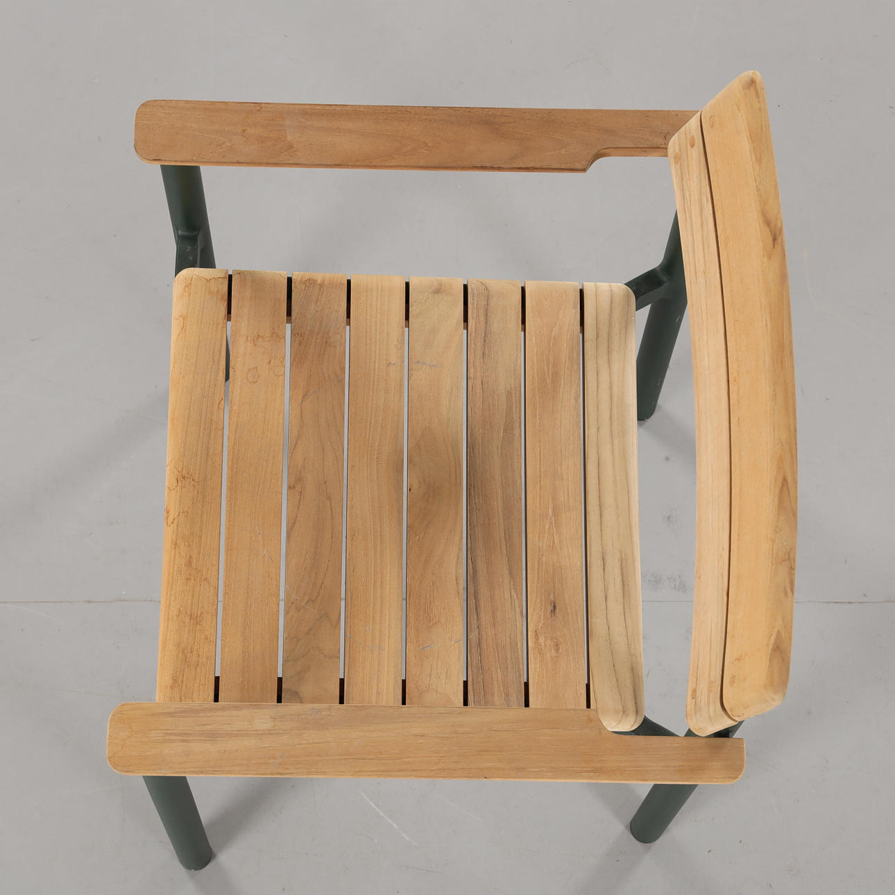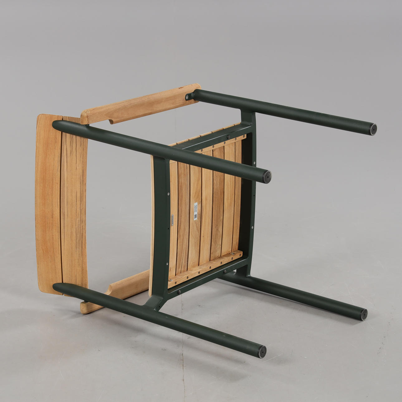 Gemarkt, Aluminium und Teakholz, Farbe Jägergrün, Sitzhöhe ca. 45 cm.