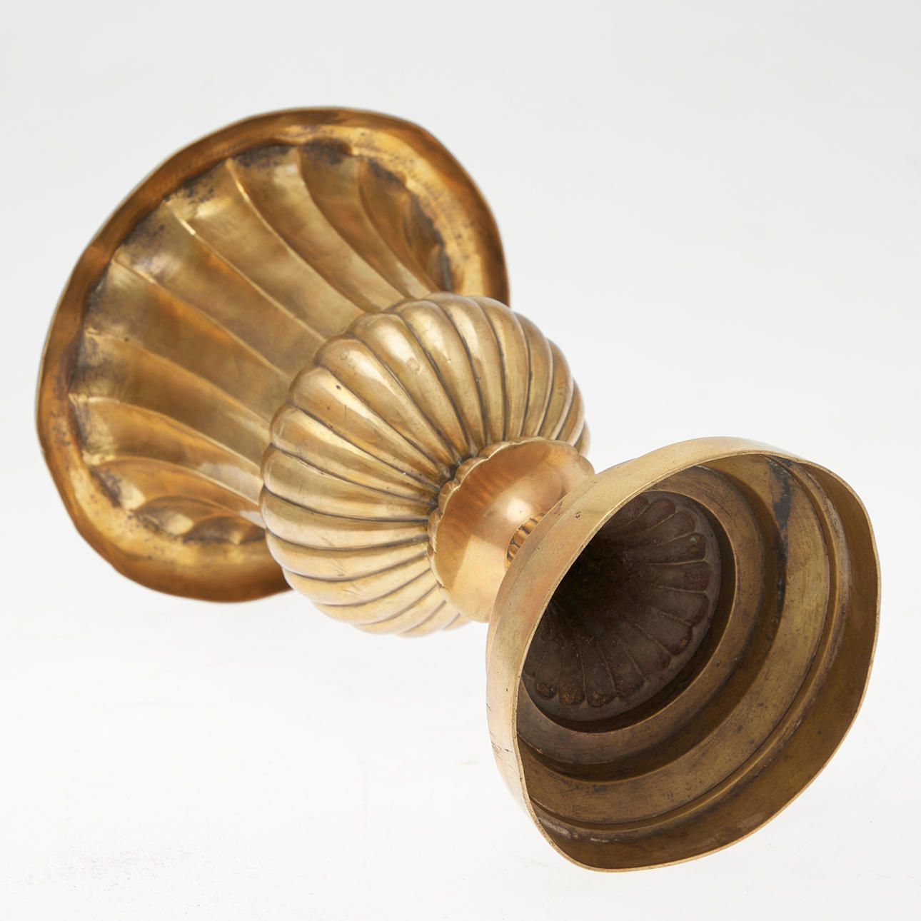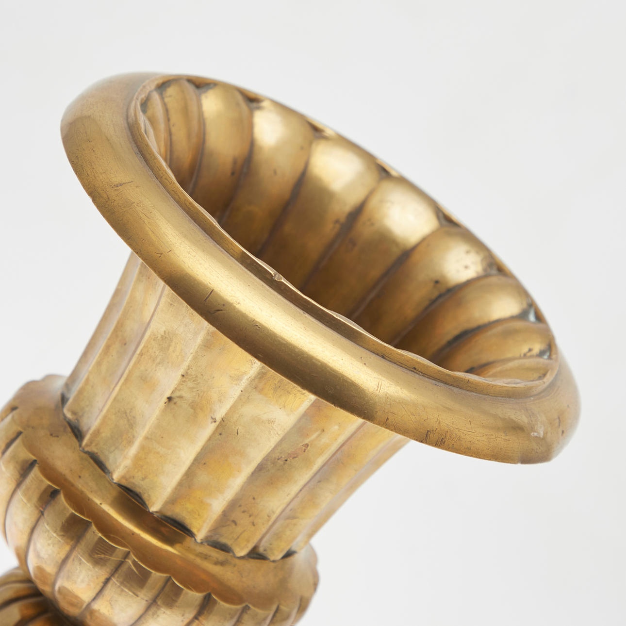 Pokalvase / Amphorvase, Messing. Pokalvase aus Messing mit einem Korpus mit godronierter Wandung und einem getreppten runden Postament, H.28,5cm, D.20,5cm.