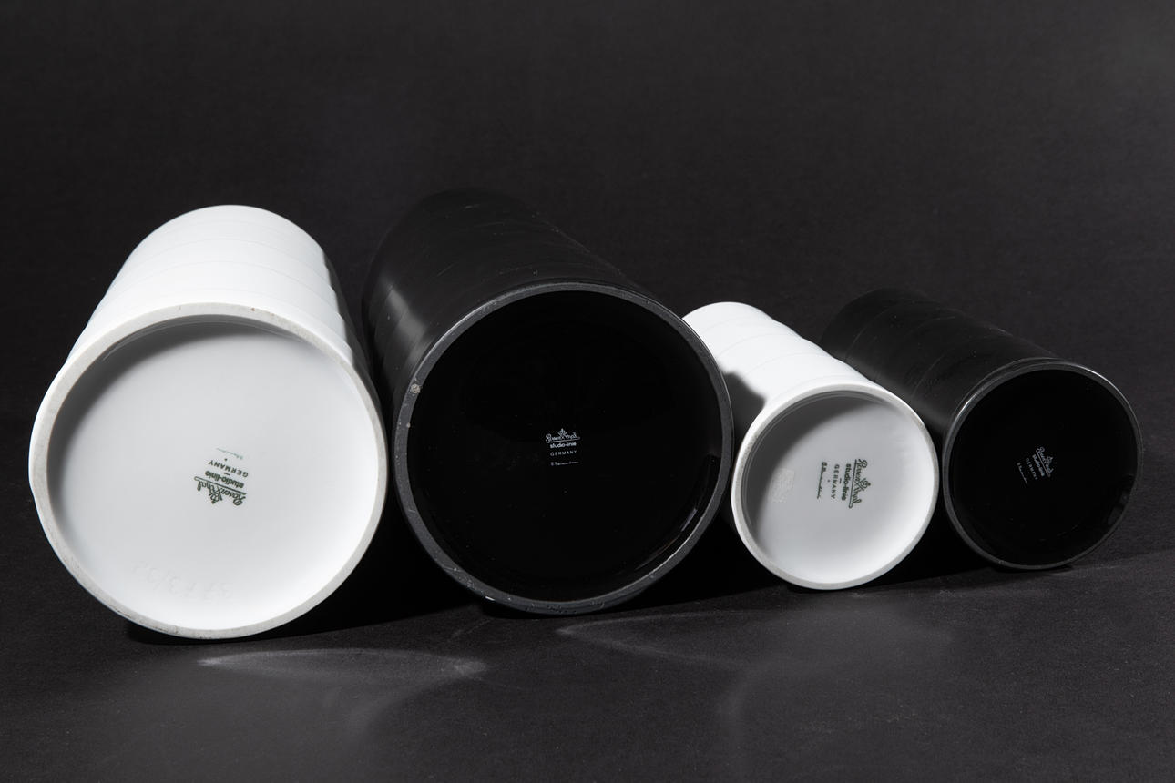 Vasengruppe. Porzellan, vierteilig und gefasst. 31,8 cm x 12,8 cm/ 21 cm x 8 cm. Am Boden bezeichnet und signiert: Firmenmarke Rosenthal studio-linie GERMANY M.Morandini.