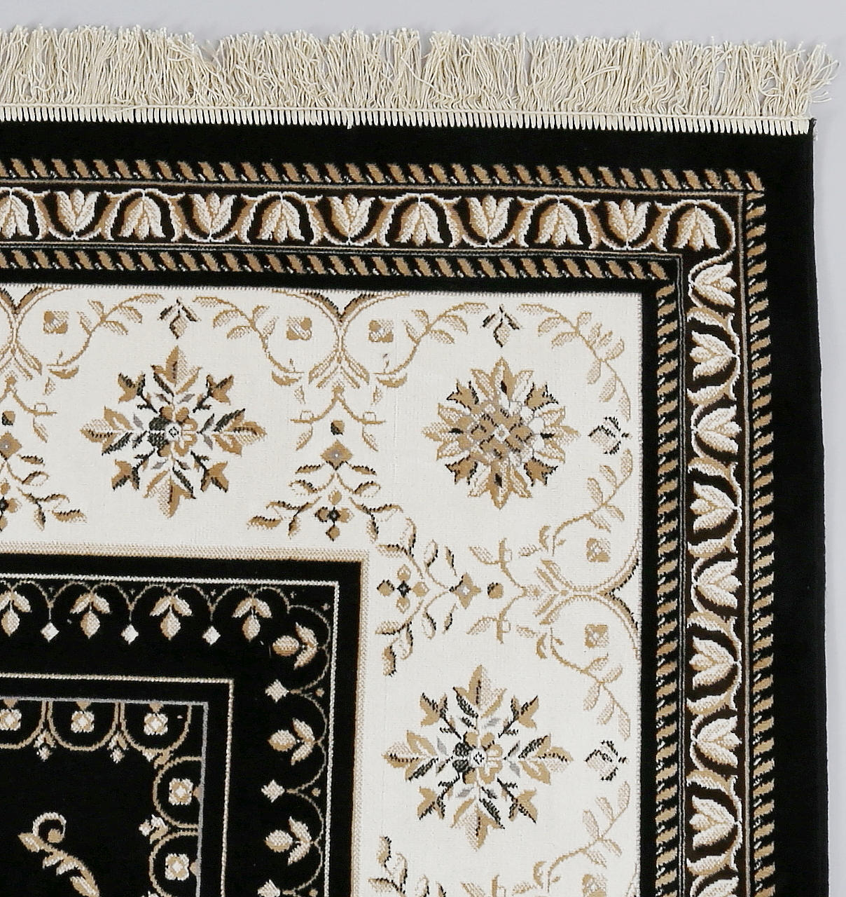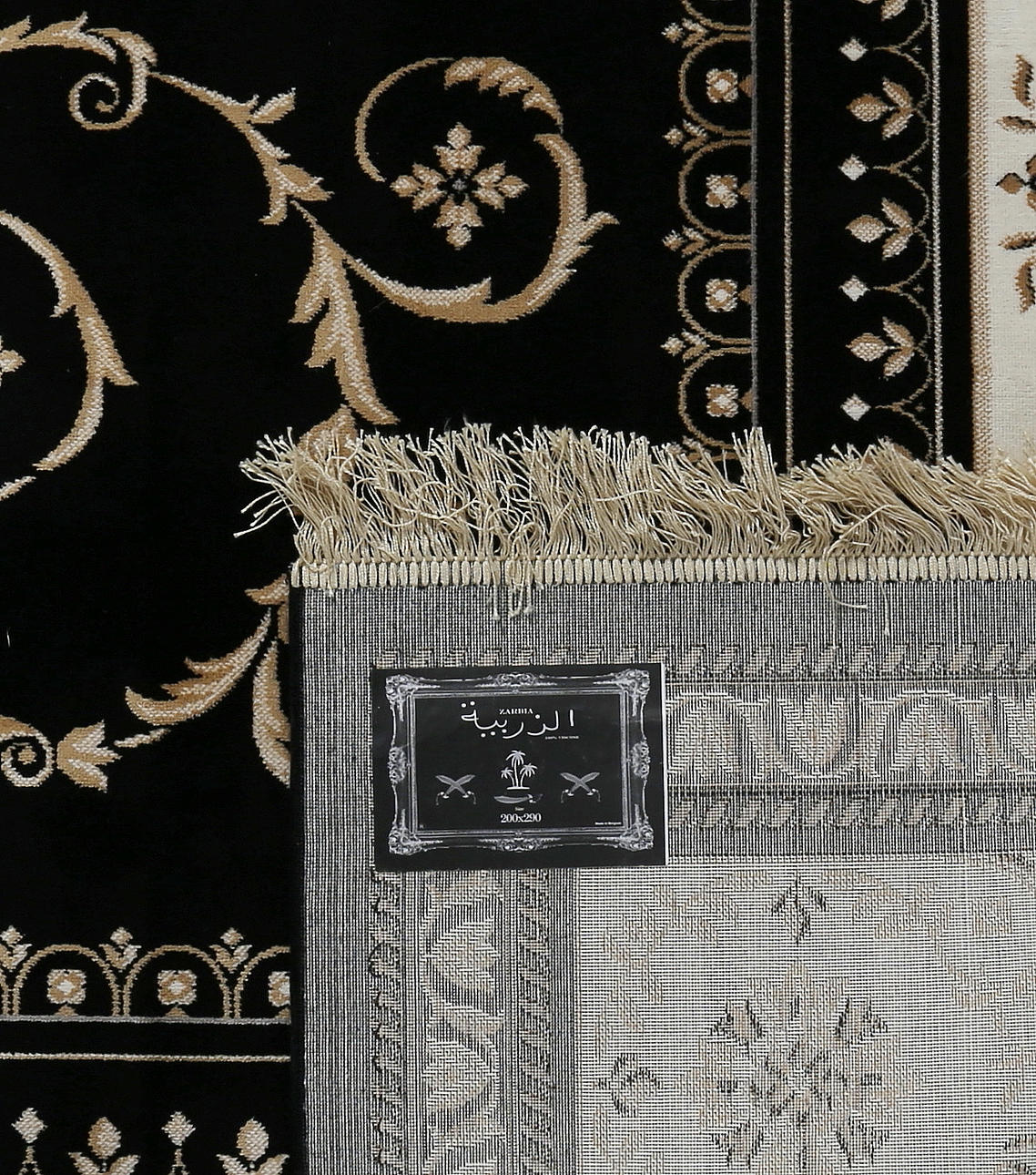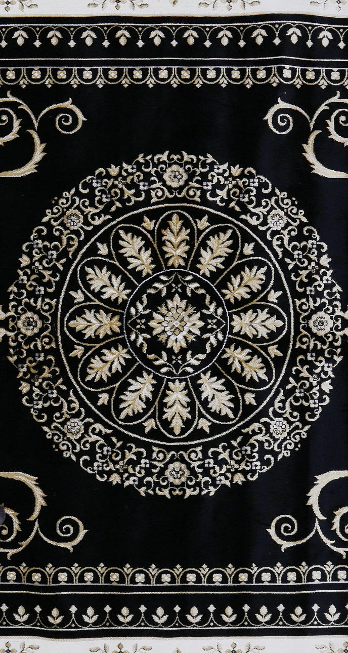 Kunstseide (Viskose), in den Farben Schwarz/Beige/Gold, maschinell gefertigt, 290 cm x 200 cm.