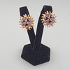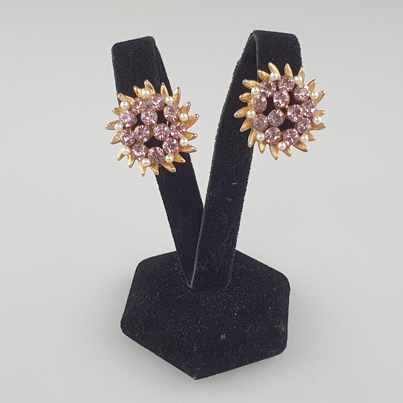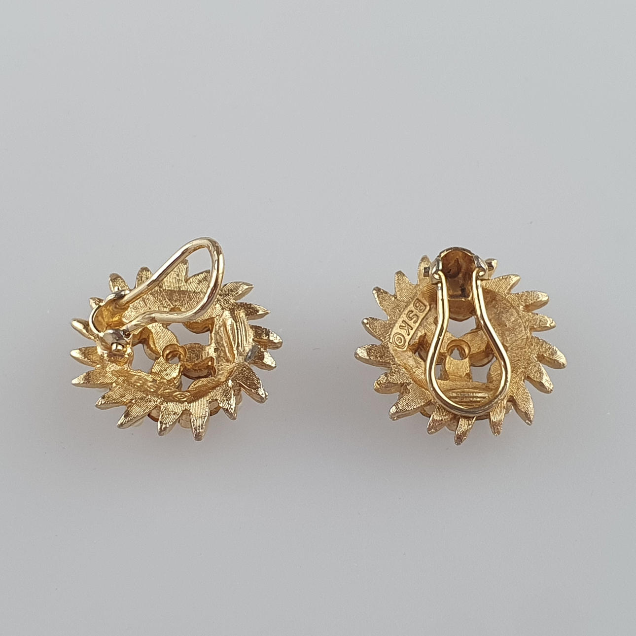 goldfarbenes Metall mit fliederfarbenem Strassbesatz und Kunstperlchen, gemarkt „BSK ©“, Dm. ca. 2,3 cm, Gesamtgewicht ca. 11,3 g.