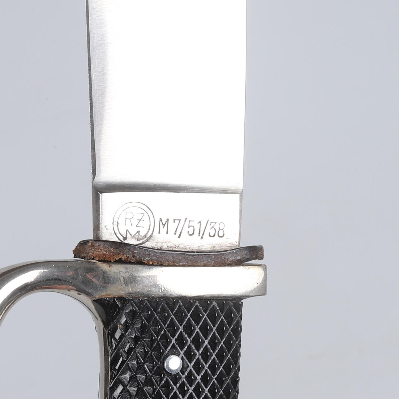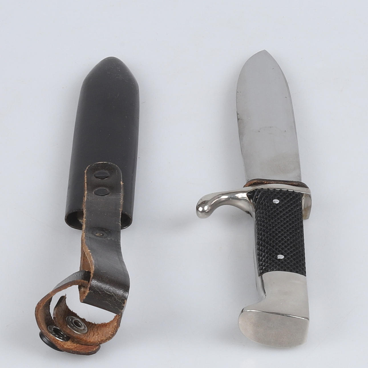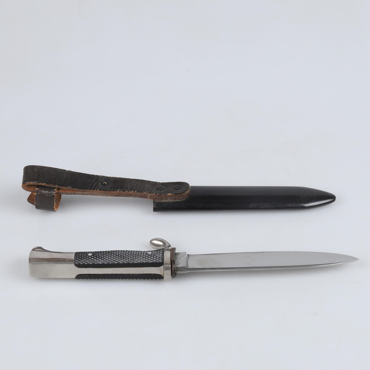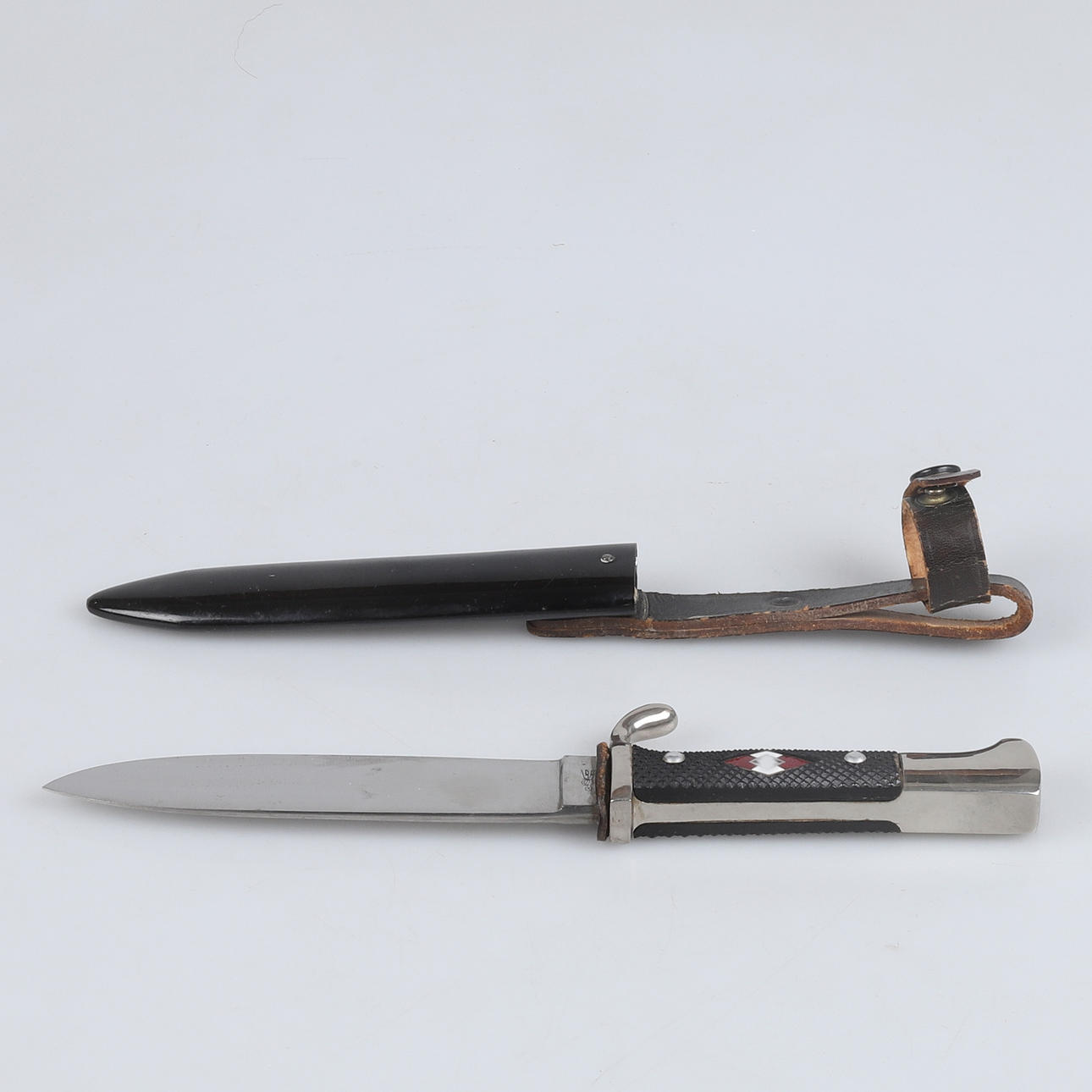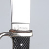 Vernickelte Montierung mit Griffschalen aus Bakelit, emailliertes Emblem mit Hakenkreuz, schwarz lackierte Wanne mit Lederanhänger. Klinge markiert RZM M7 51/38 Länge 24,5 cm.