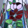 Holzfuß mit Reliefdekor, sechseckiger Schirm aus farbigem Glas mit Bleibändern, elektrifiziert, neuzeitlich, HxD: ca. 61x36cm.