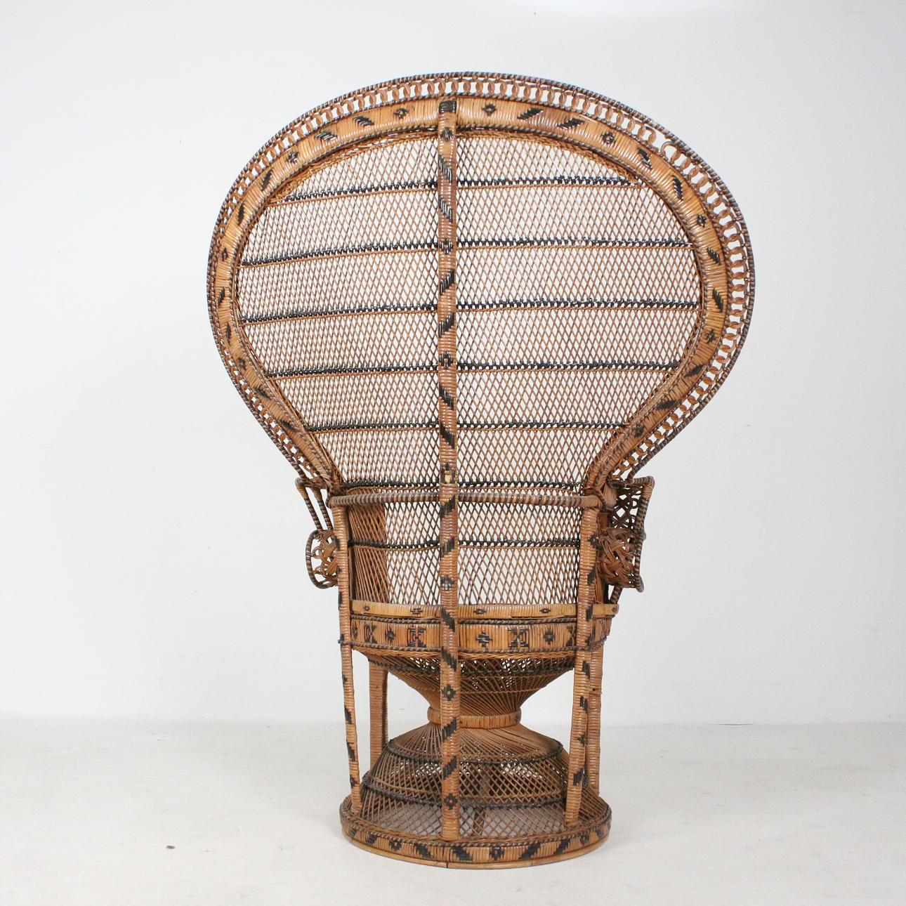 Emanuelle-Sessel / Pfauenthron, Sessel aus Rattan-Geflecht mit hoher Rückenlehne, Armlehnen, einer runden Sitzfläche sowie einem runden Fuß,