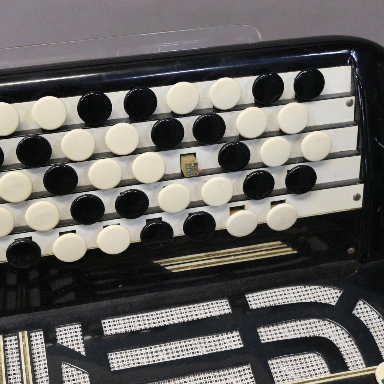 Ein Knopf am Akkordeon lose, (im Lieferumfang enthalten). Tasche mit beschädigtem Öffnungsmechanismus.