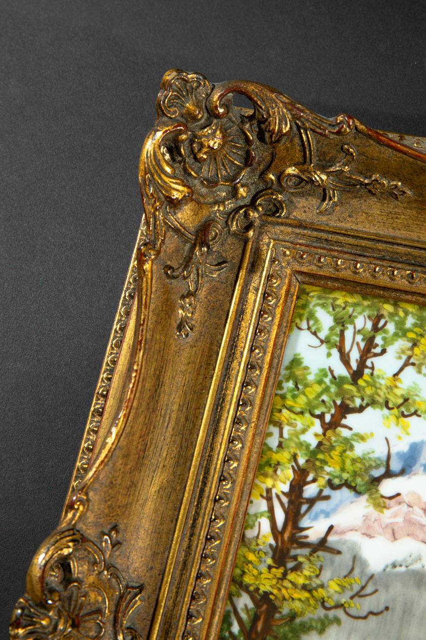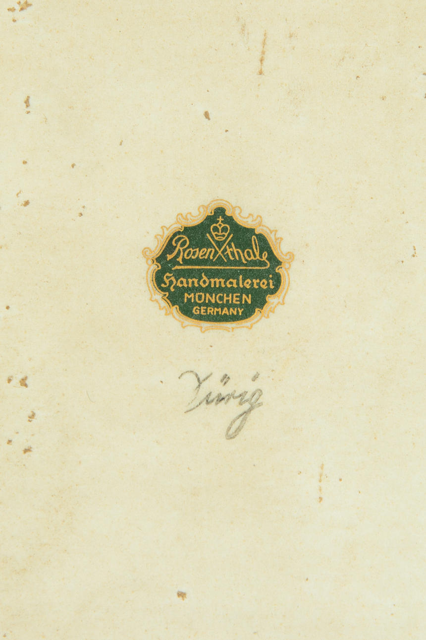 Stillleben. Porzellan, farbig und glasiert in vergoldetem Holzrahmen gefasst. 36 cm x 41 cm x 6 cm (Rahmen)/ 24 cm x 30 cm (Bildplatte). Auf der Rückseite mit grünem Aufkleber bezeichnet und handschriftlich signiert. Firmenmarke Rosenthal handmalerei München GERMANY Dürig.