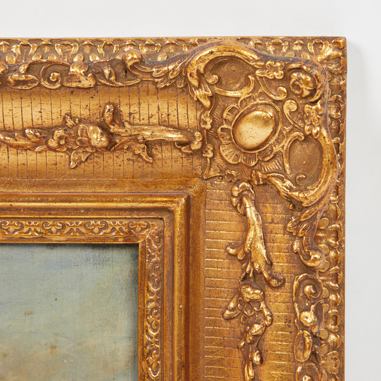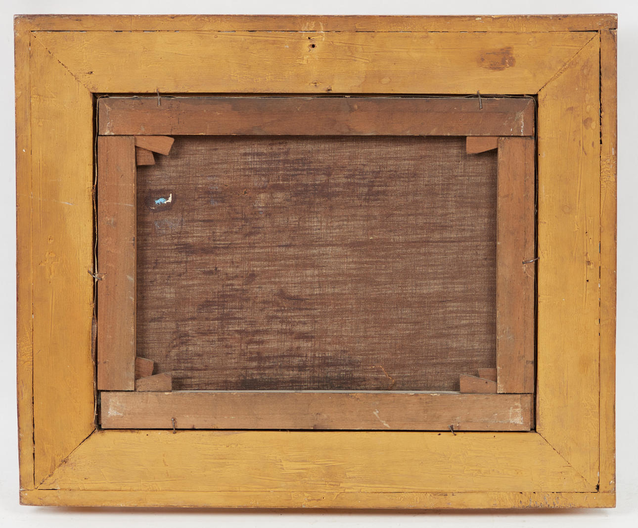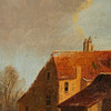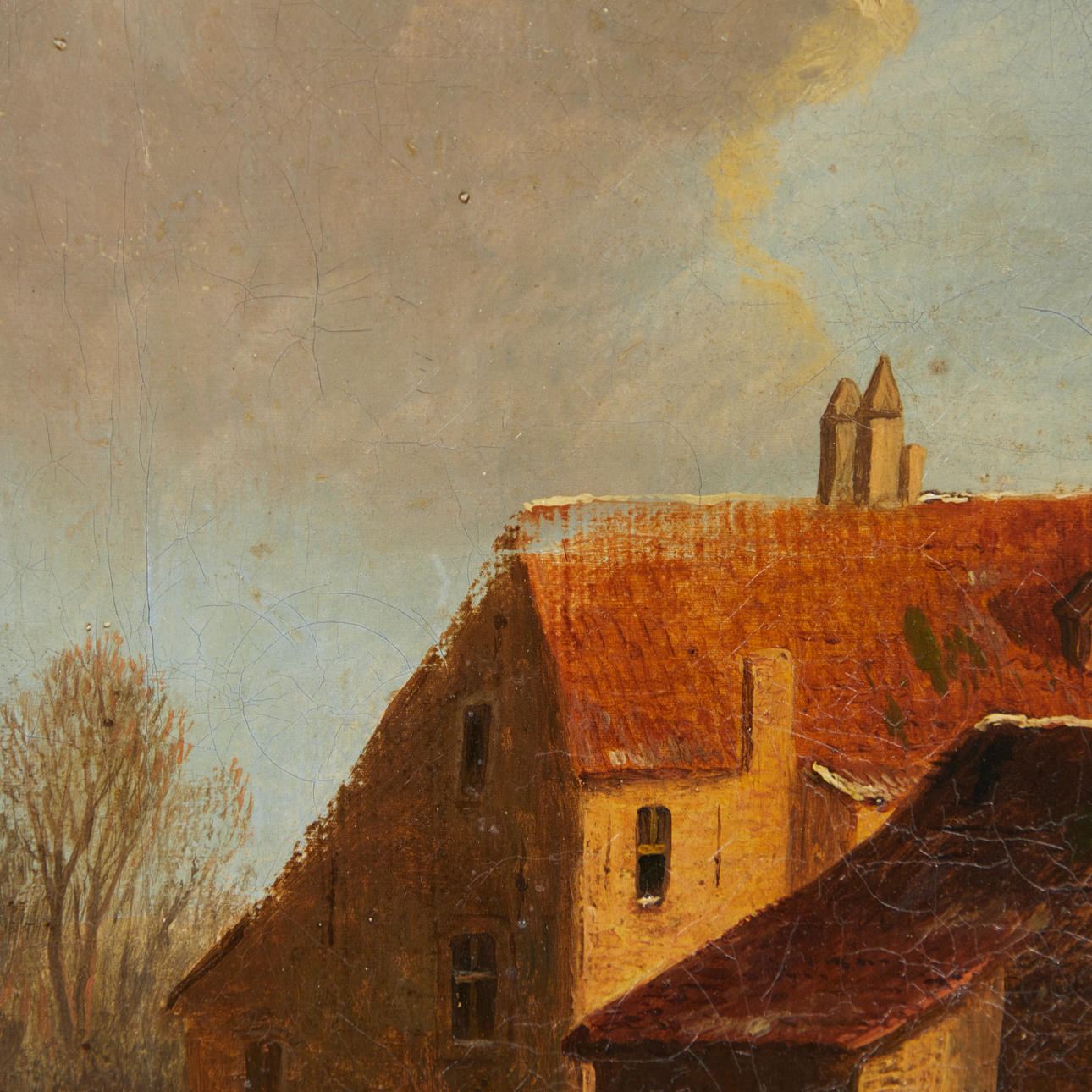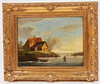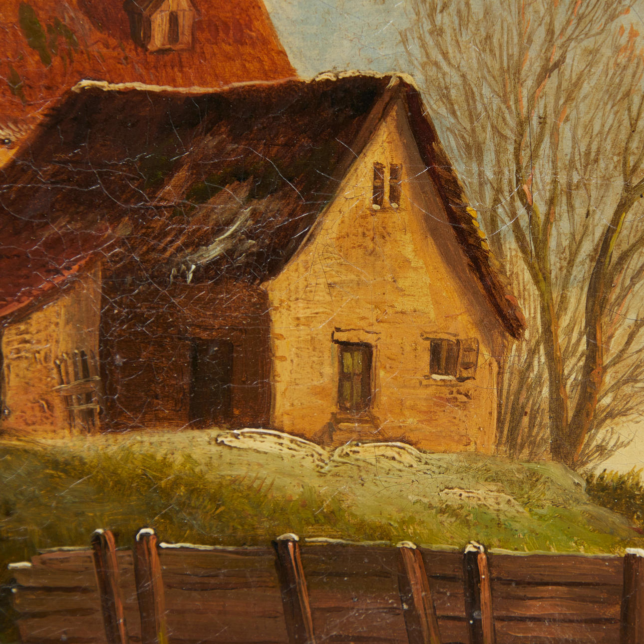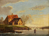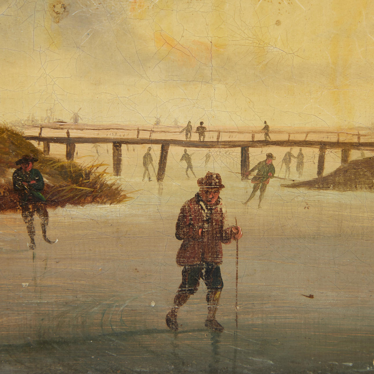 Unbekannte/r Künstler*in, Gemälde, Eisvergnügen, Öl auf Leinwand. Darstellung eines ländlichen Exterieurs bei Sonnenschein mit auf einem zugefrorenen See Schlittschuh laufenden und Eishockey spielenden Personen, 39,5x30cm (47x55cm).