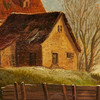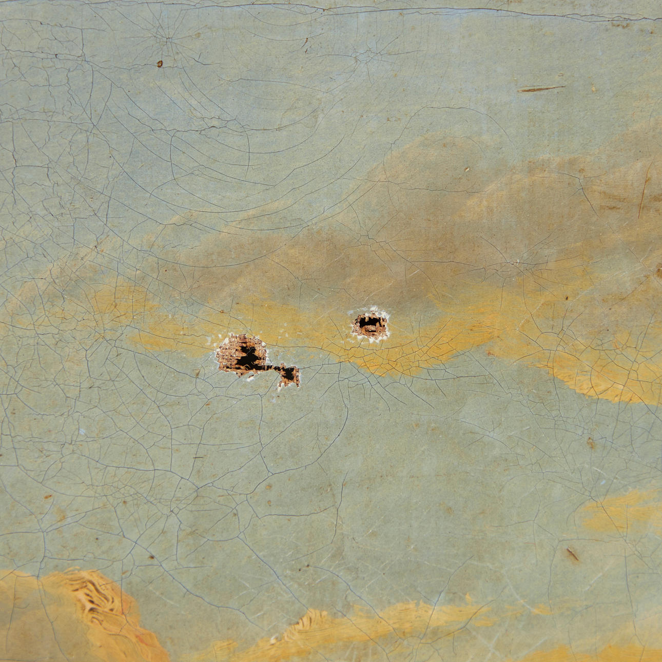 Krakelee, rahmenbedingte Druckstellen, drei Löcher sowie eine provisorisch restaurierte Stelle.