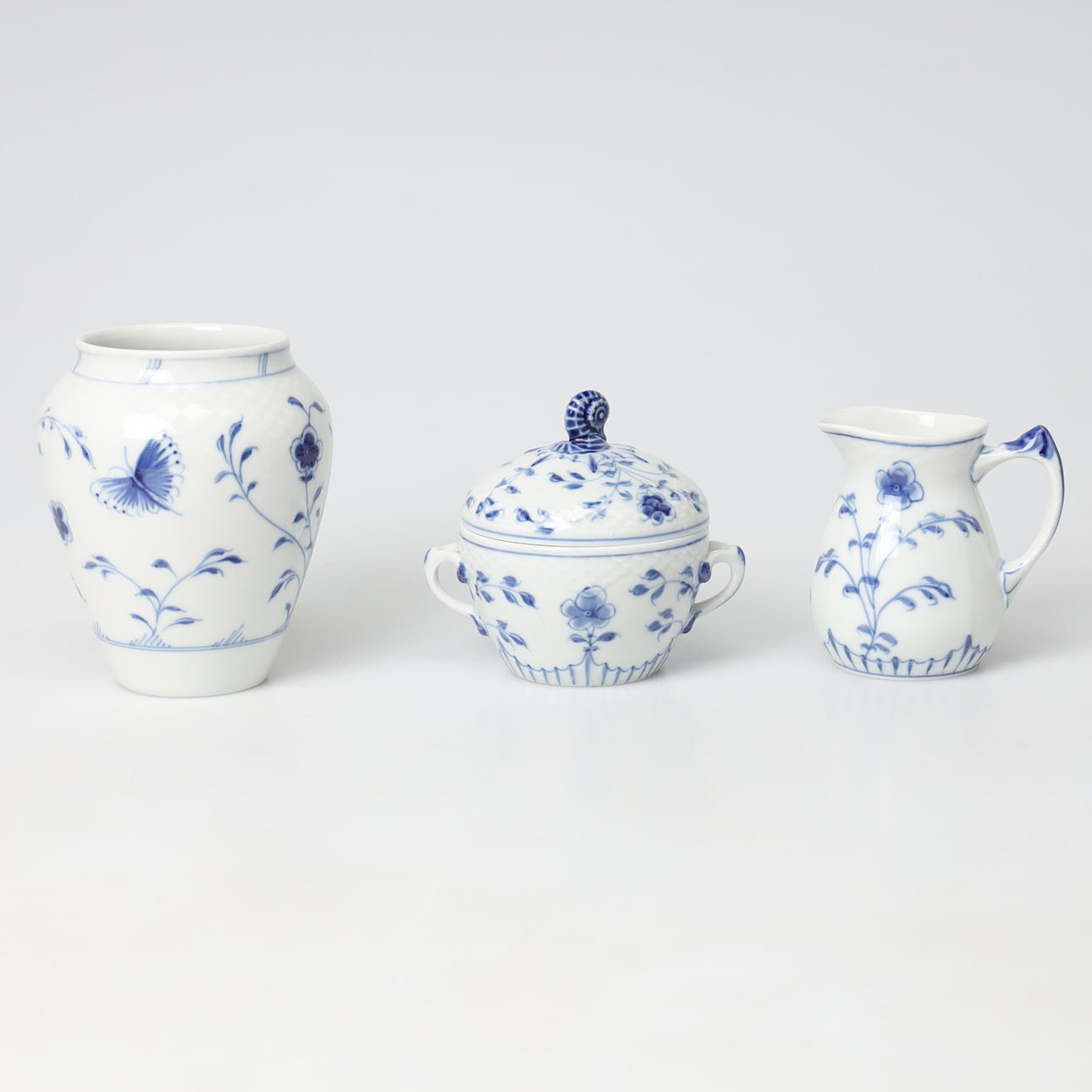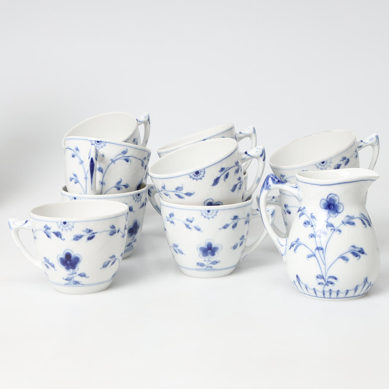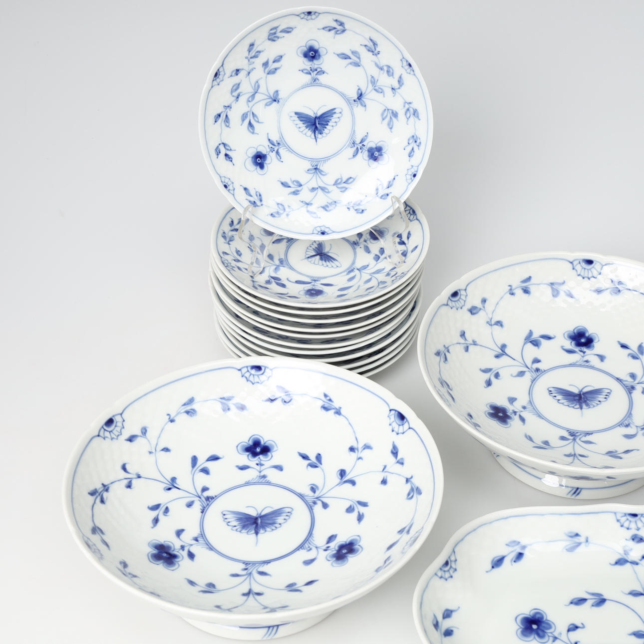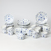 12 Tassen, Nr. 305, 1 erste Sorte, 11 zweite Sorte, 12 Untertassen, Nr. 305, 1 erste Sorte, 11 zweite Sorte, 12 Teller, Nr. 616, 1 erste Sorte, 11 zweite Sorte, 2 Schalen auf Füßen, Nr. 428, 2. Klasse, Höhe ca. 7 cm, Durchmesser ca. 20 cm, Vase, Nr. 681, 2. Klasse, Höhe ca. 13 cm, Schale, Nr. 354, 2. Klasse, Höhe ca. 3,5 cm, Durchmesser ca. 23cm.