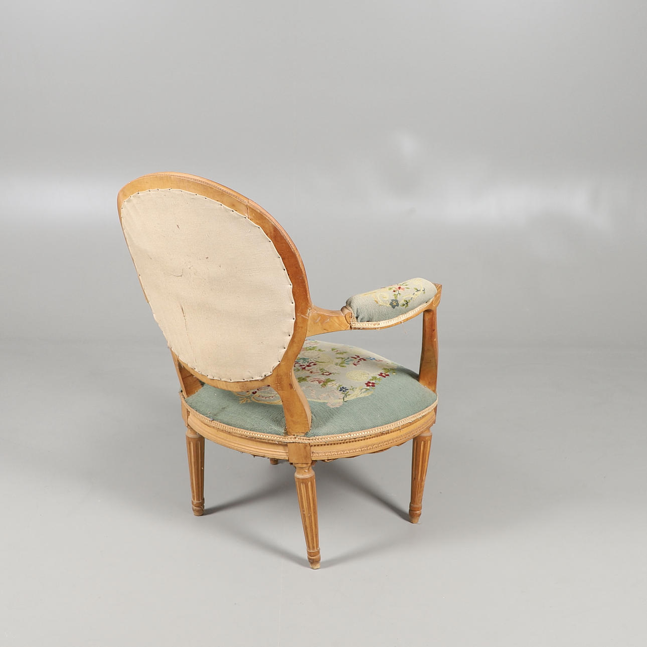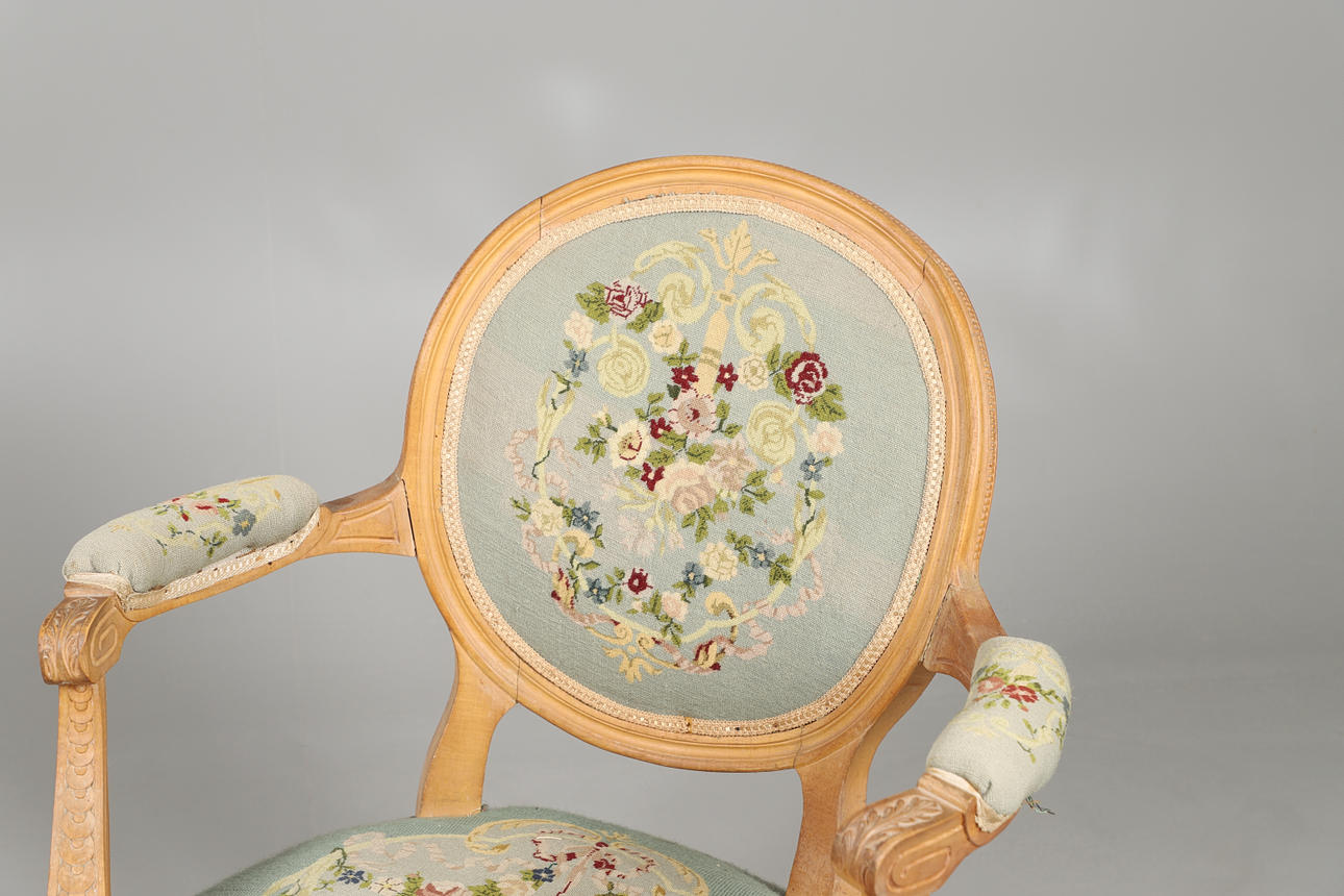 2464815. EIN GESCHNITZTER SITZSTUHL MIT BLUMENGEWEBE.
