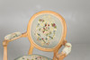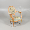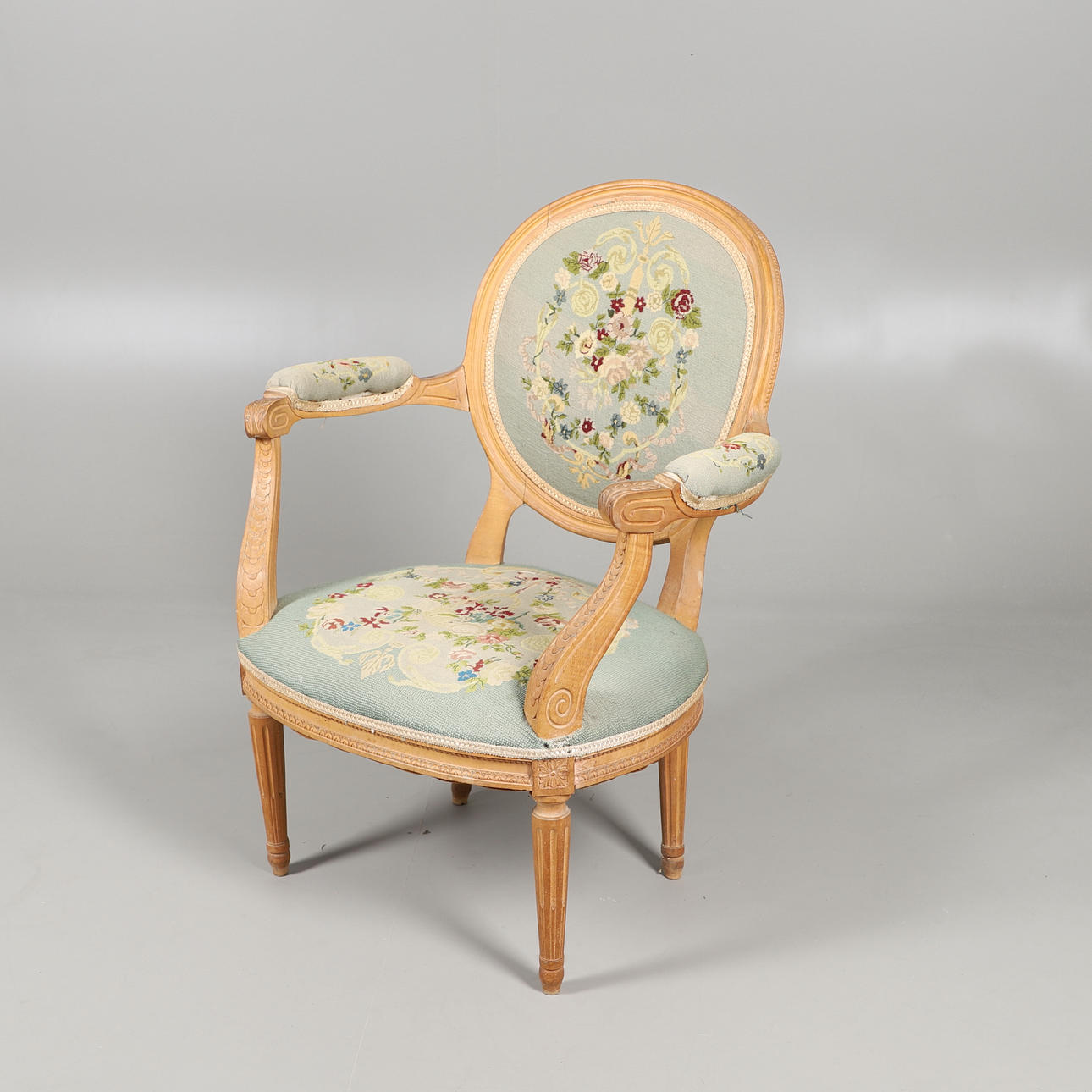 Ein geschnitzter Sessel aus heller Eiche mit gesticktem Gobelin-Sitz auf Beinen aus Schilfrohr. Gesamthöhe 90cm, Sitzhöhe 38cm.