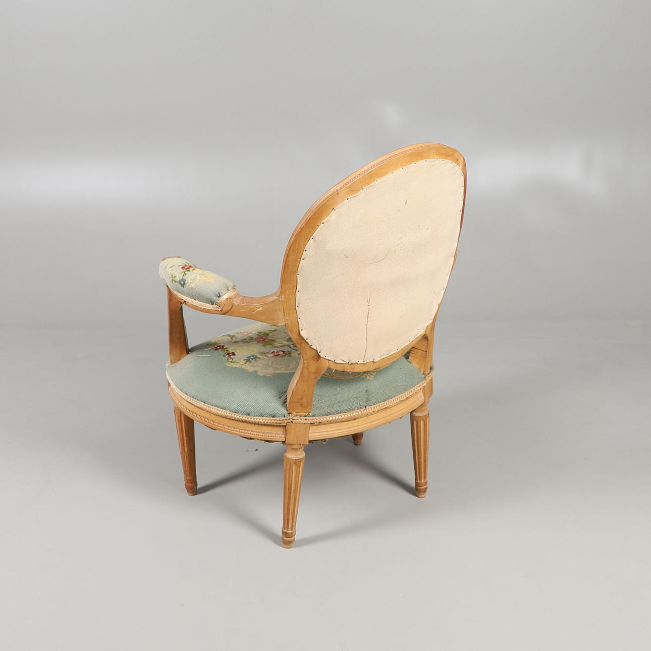 Mit Gebrauchsspuren überall mit Schrammen am Holz und Ausbleichen am Gobelin und leichten Beschädigungen. Stabiler brauchbarer Zustand.