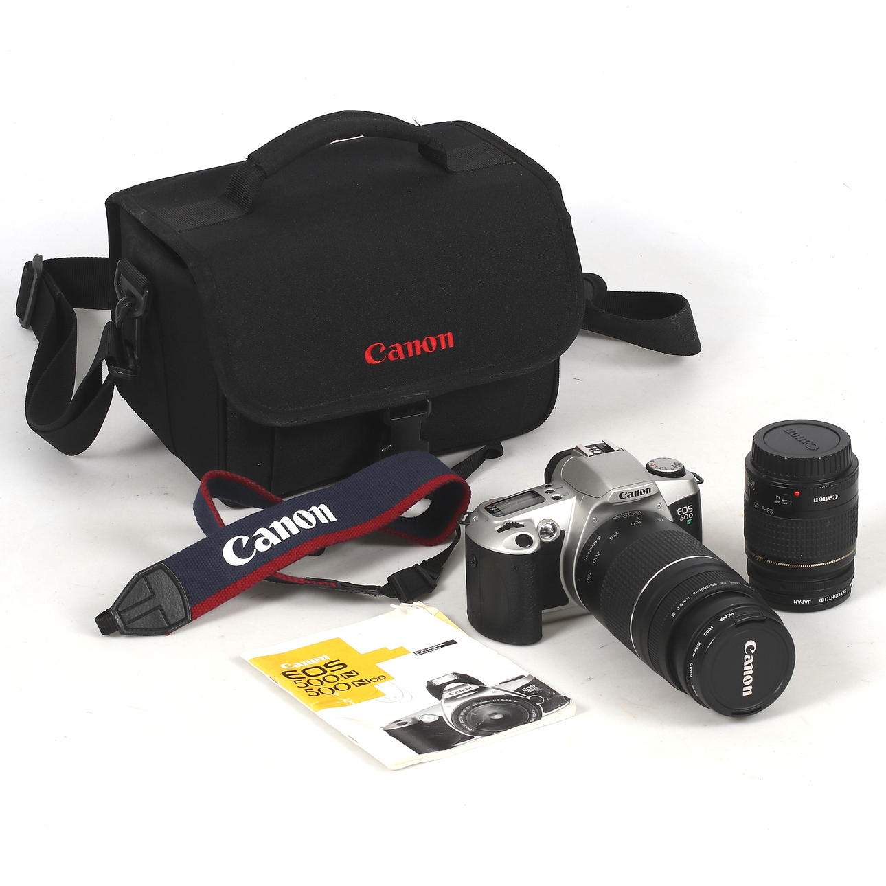 Kamera, EOS 500 mit Canon Zoom EF 28–80 mm, 1:3,5–5,6 und Canon Zoom EF 75–300 mm, 1:4–5,6. UV-Filter. Canon-Tasche. Ständer, Höhe 45 - 138 cm.