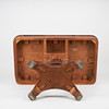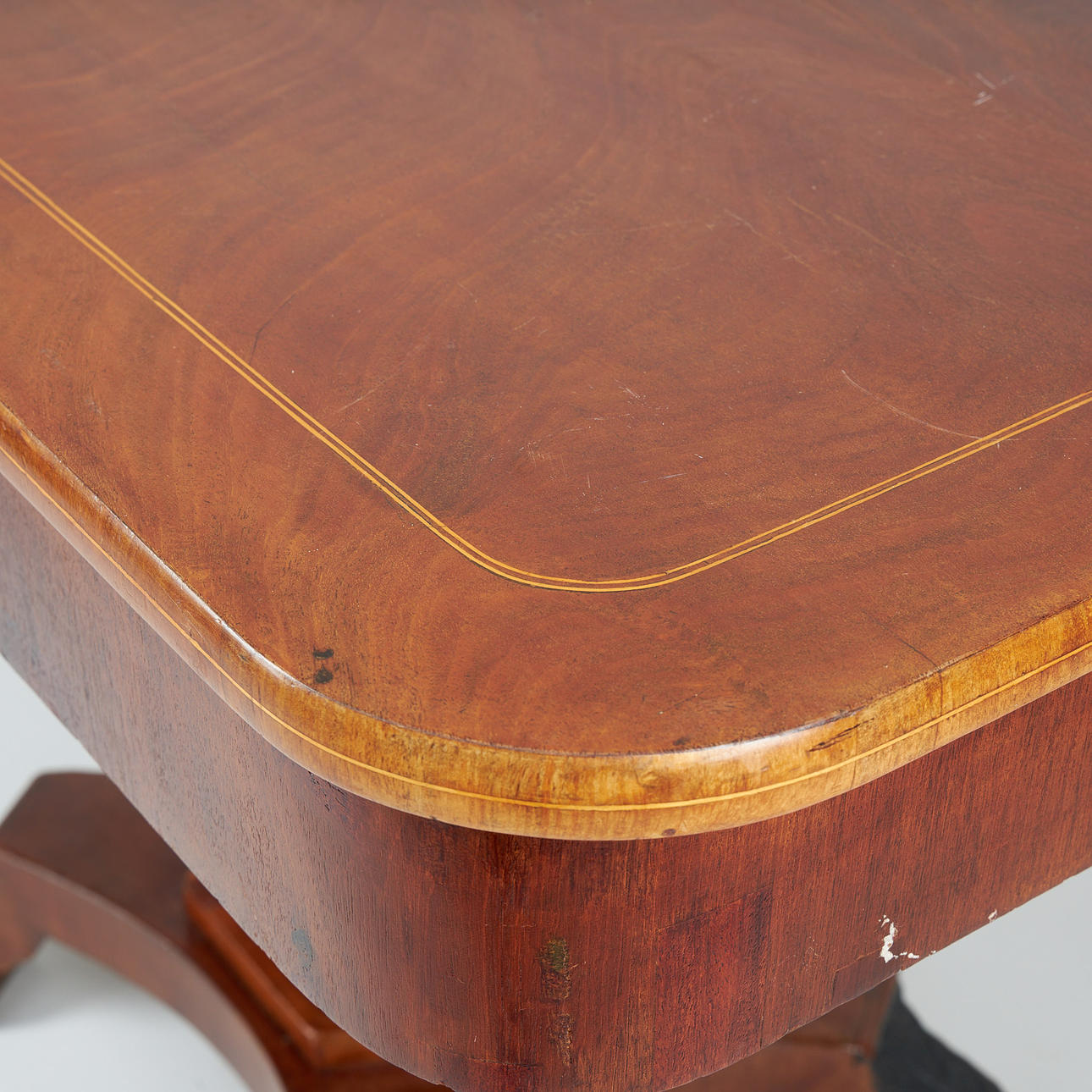 Mahagoni-Furnier. Abgerundete Ecken, Säulenfuß. Vierteilige Fußplatte mit Tatzenfüßen. Länge 109 cm, Breite 65 cm, Höhe 75 cm.
