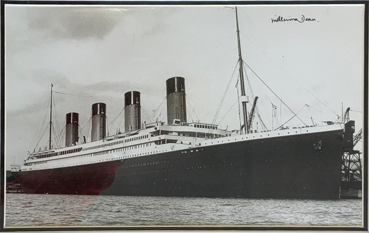 Ein gerahmtes Foto, signiert von Millvina Dean (Britin 1912 - 2009), der jüngsten Überlebenden der Titanic, mit Echtheitszertifikat, Rahmengröße 49,5 x 49,5 cm.