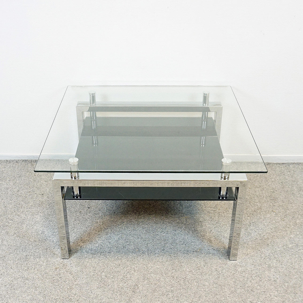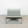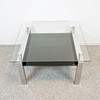 Transparente Tischplatte und Ablage aus schwarzem Glas, Fuß verchromt. Bezeichnet "Tempered Glass" (gehärtetes Glas). Höhe ca. 45,5 cm, Platte ca. 80x80 cm, Ablage ca. 63x69.