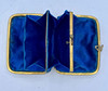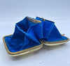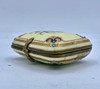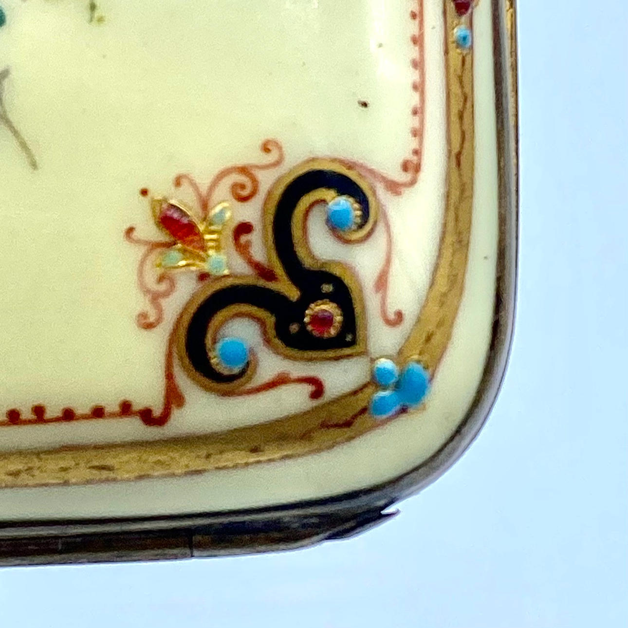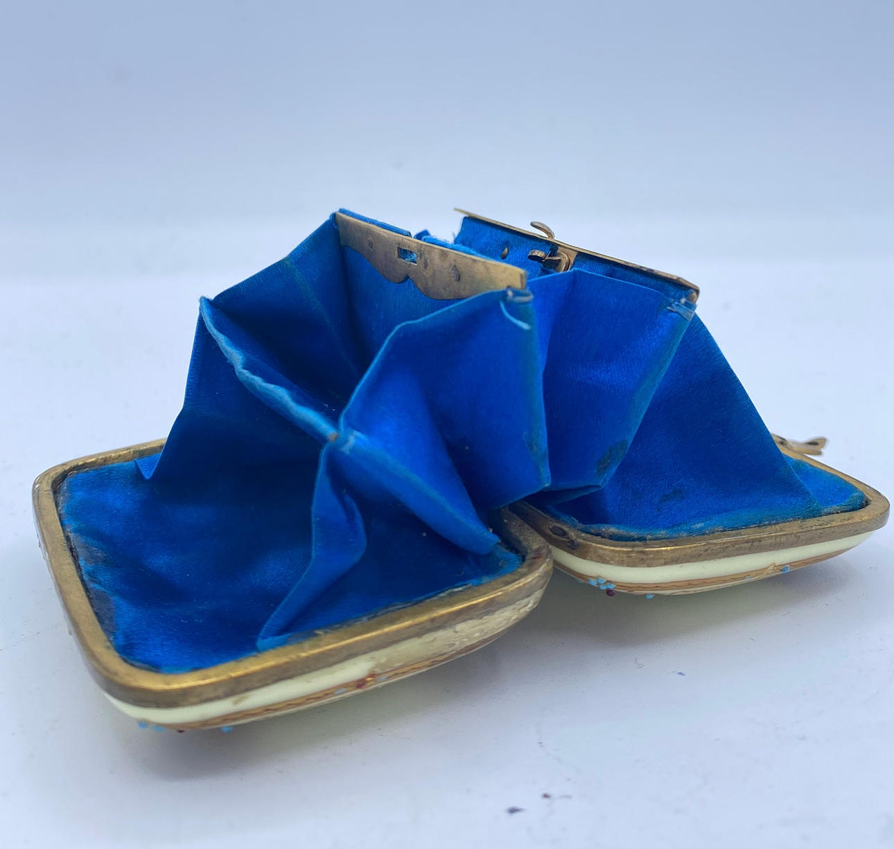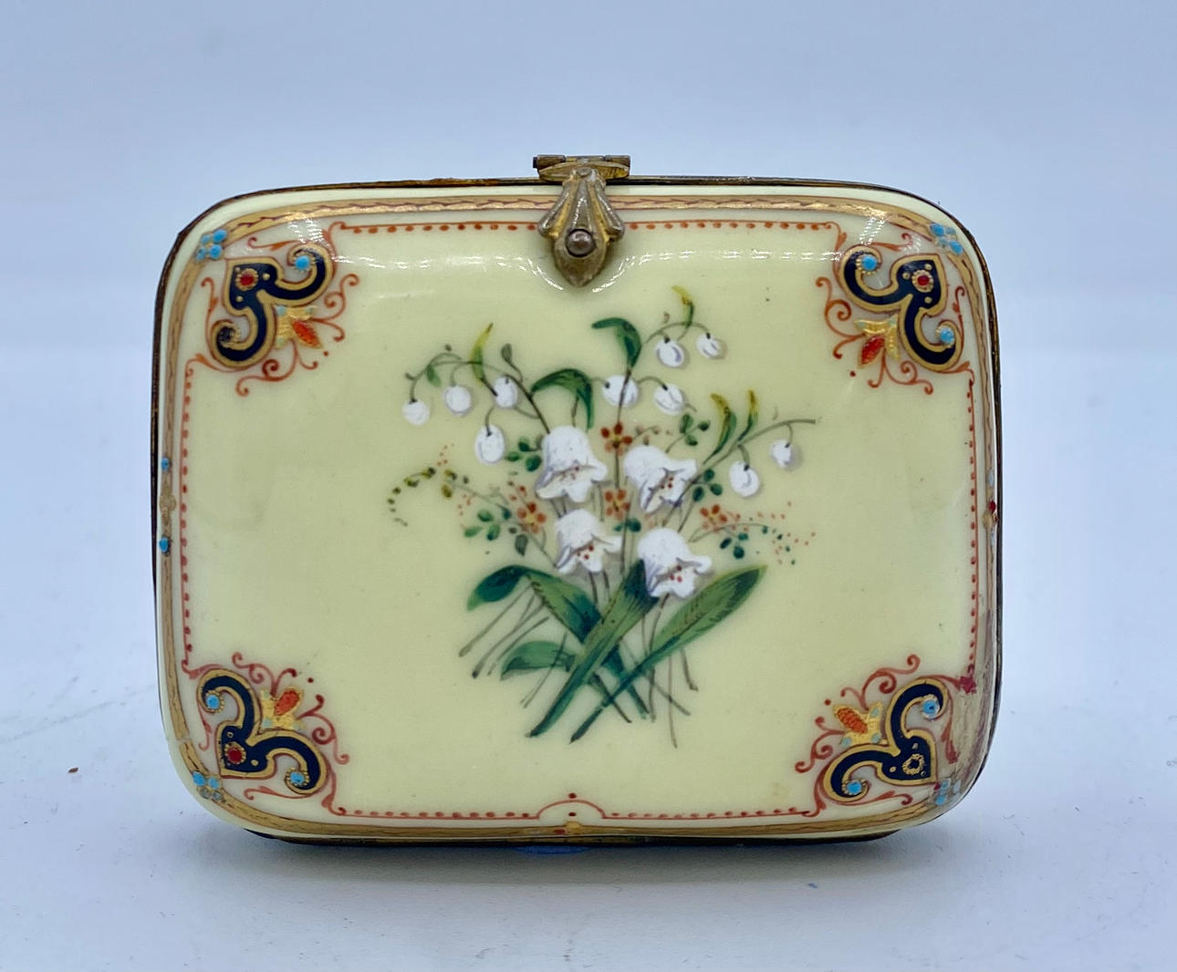 Gelbe Emaille mit handbemalten Glocken und abgerundet mit einem Rand an den Ecken von Schriftrollen mit goldenen Details. Geschnittener goldener Messingverschluss. Interieur aus blauer Seide. 5,5 x 7 x 2,5 cm.