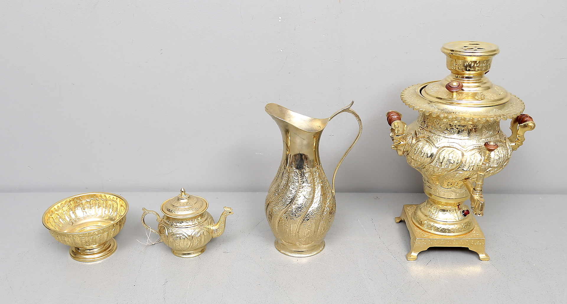 249505. SAMOVAR usw., 4 Teile, Messing, 1900er Jahre.