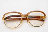 Vergoldetes Brillengestell mit pastellblau getönten Gläsern. Herstellerbezeichnung und Herstellersignet. Originales Lederetui.