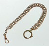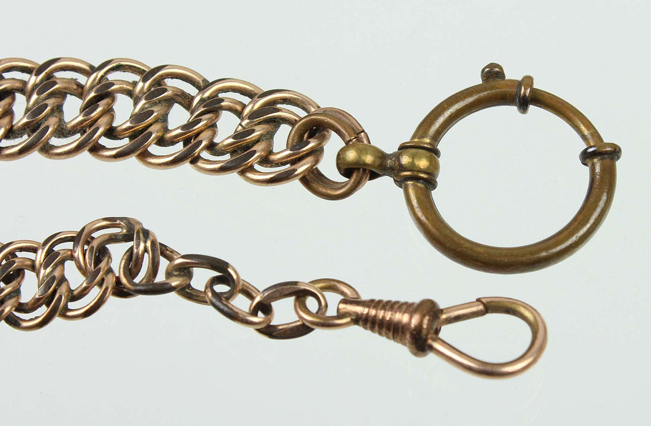 antike Uhrenkette in Golddoublé, Pforzheim um 1900 mit Karabiner und einen großen Federring, die Kette ist im Verlauf ausführt, mittlere Breite 12 mm, Länge 27,5 cm.