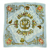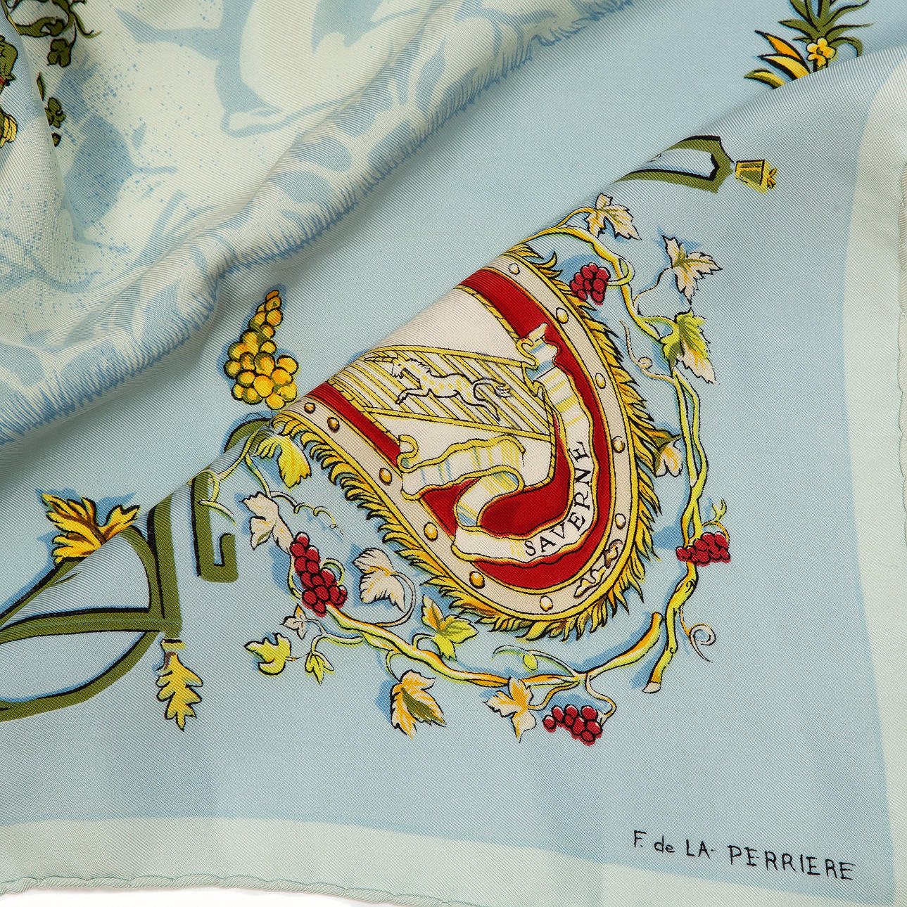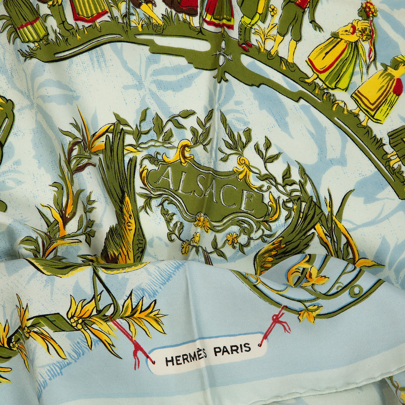 Seide, bezeichnet "HERMÈS-PARIS". Entworfen und signiert von Francoise de la Perrier im Jahr 1960. Zwei Kräne halten das Wappen des Elsass, im Hintergrund die Umrisse der Stadt. Im Kreis um diesen arbeitenden Bauern. Ecke mit Dekoration des Stadtwappens. Etwa 86 x 86 cm.