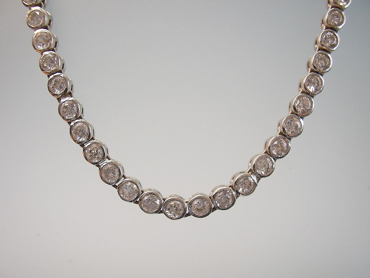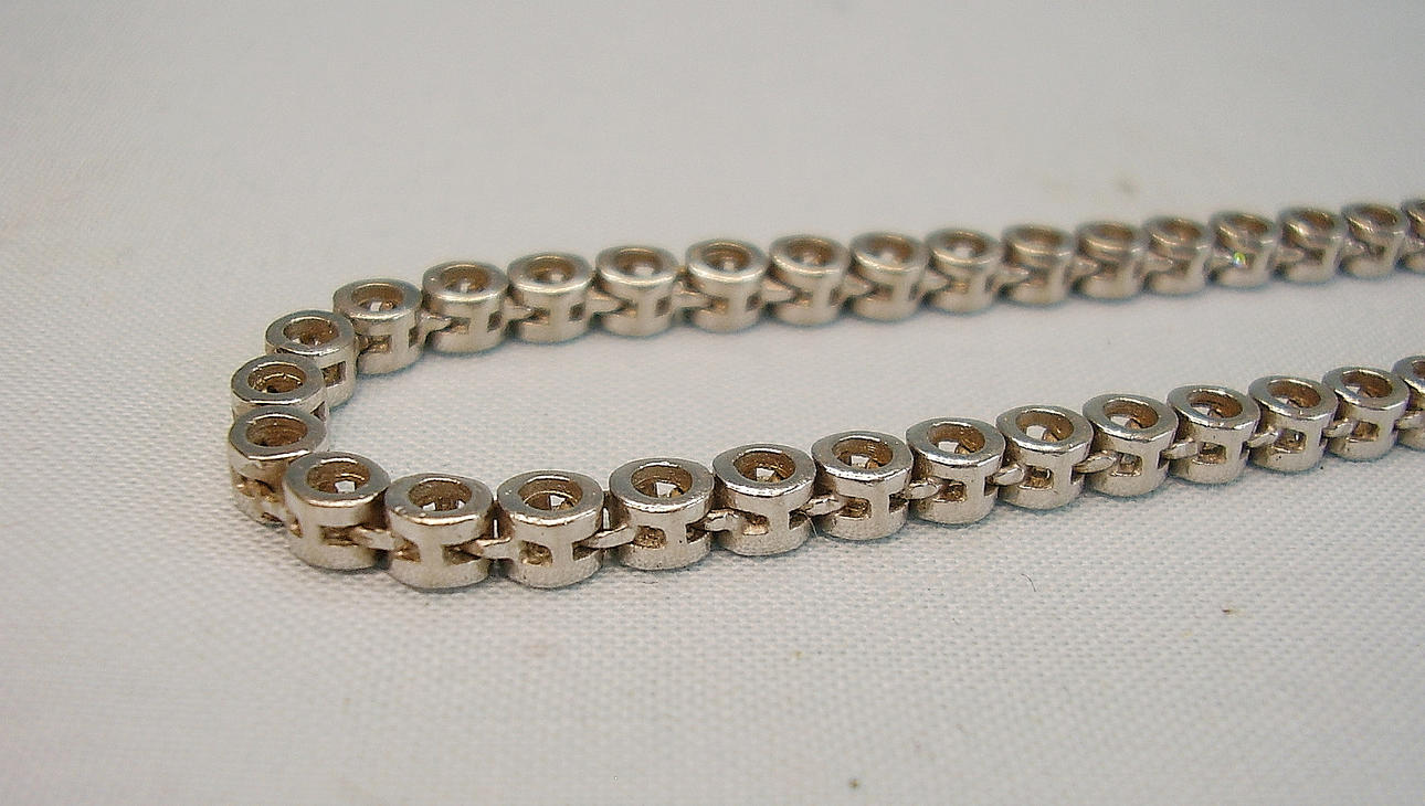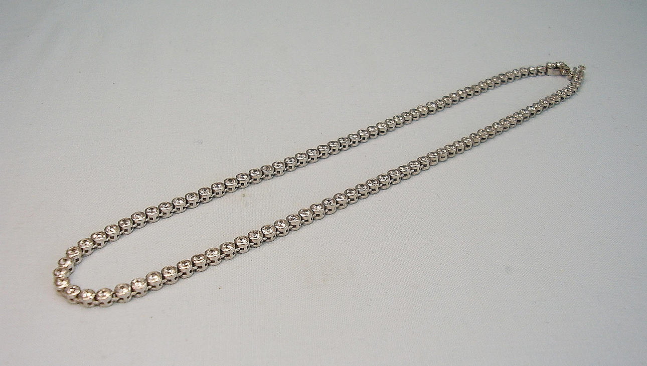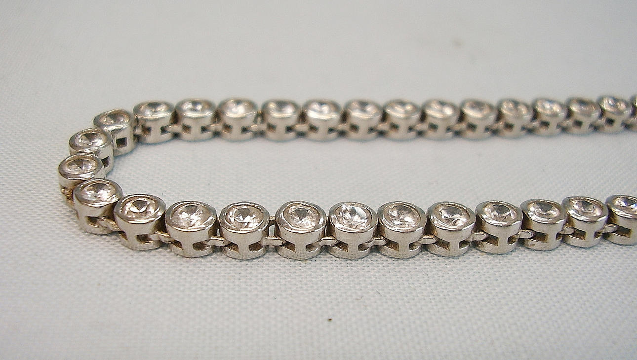 Es ist als Riviere-Kette ausgeführt und mit rund facettierten Strass-Steinen besetzt.