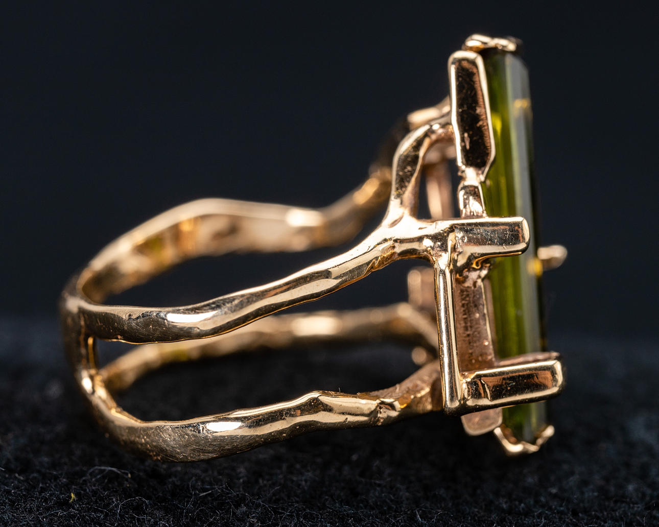 Ring gefertigt aus 585er Gold, besetzt mit einem Turmalin von ca. 4 mm x 20 mm. Ringgröße ca. 53. Gewicht ca. 5,7 Gramm.