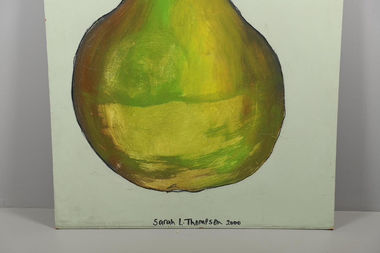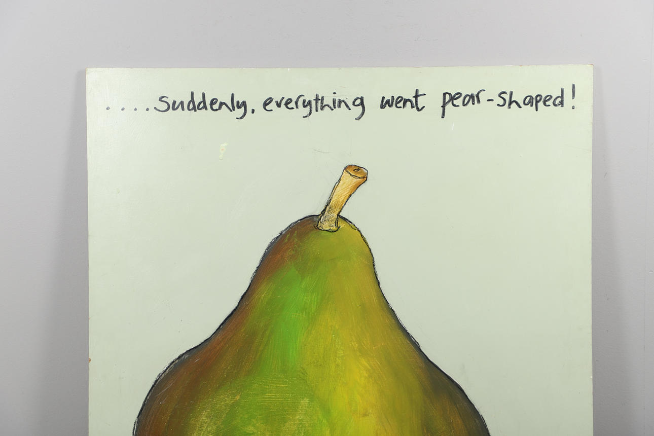 Ein großes, ungerahmtes, humorvolles Bild einer Birne mit der Aufschrift „...Plötzlich wurde alles birnenförmig!“, gemalt von Sarah L. Thompson 2000. Kann an der Wand montiert werden, Größe: 123 cm x 92 cm.