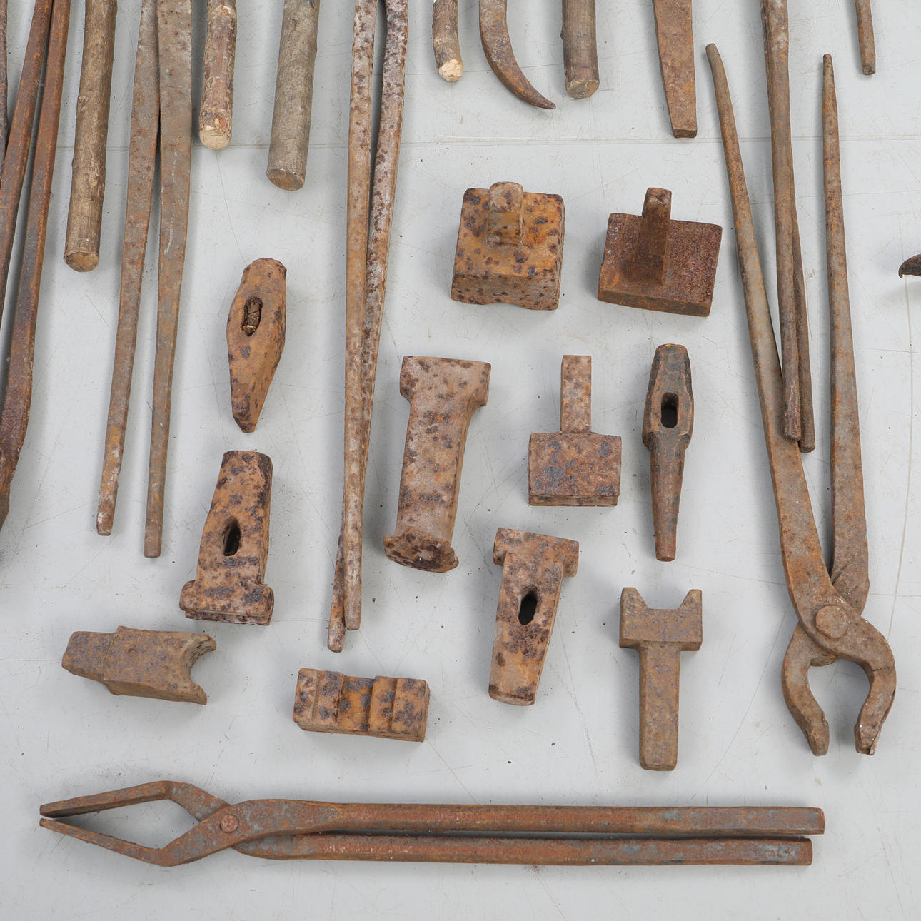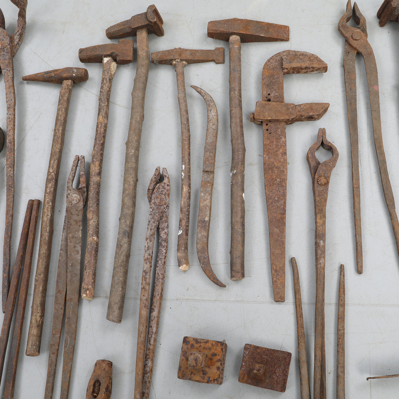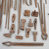 Ein Menge antike Schmiedewerkzeuge, hier finden Sie alles von Zangen über Hämmer bis hin zu Formschablonen.