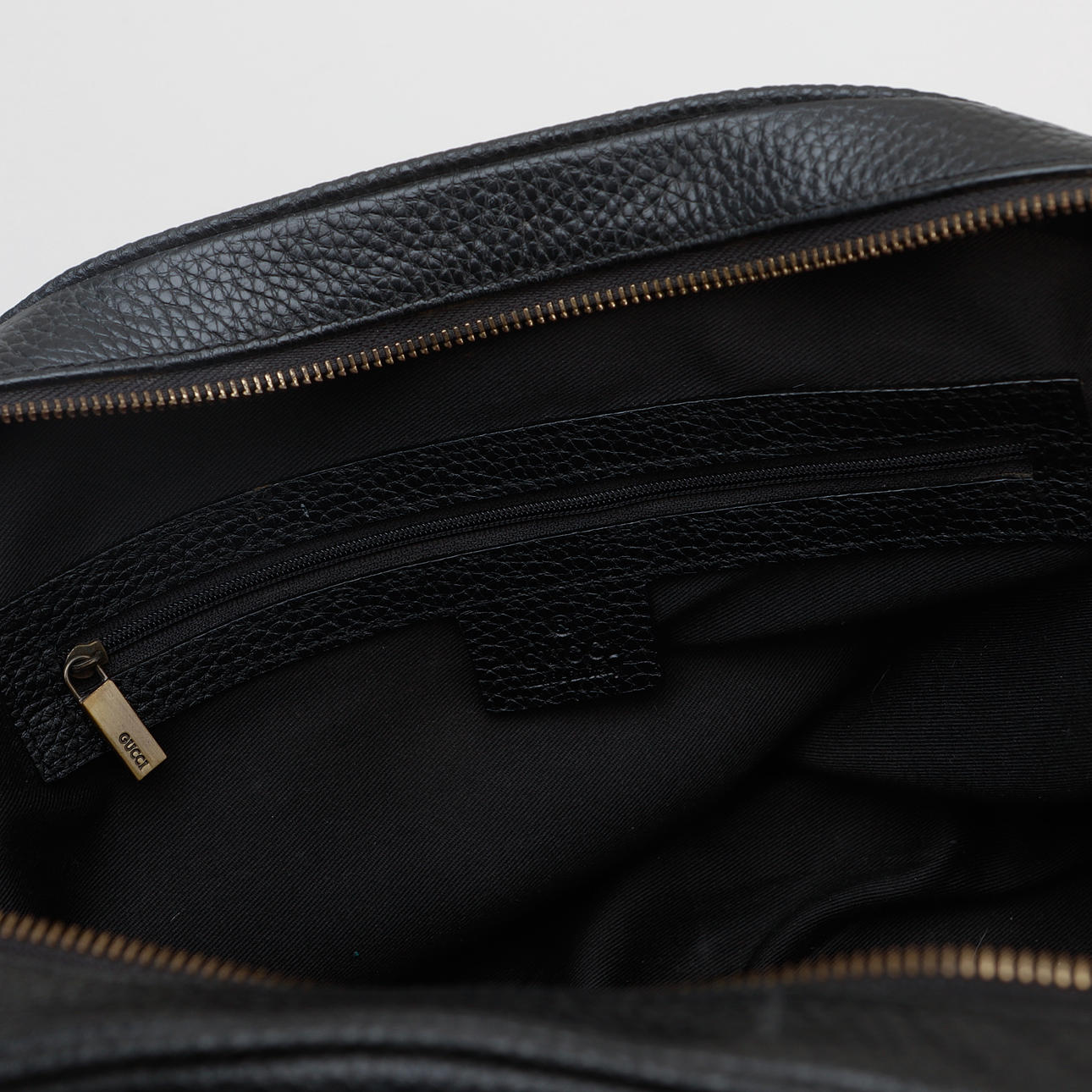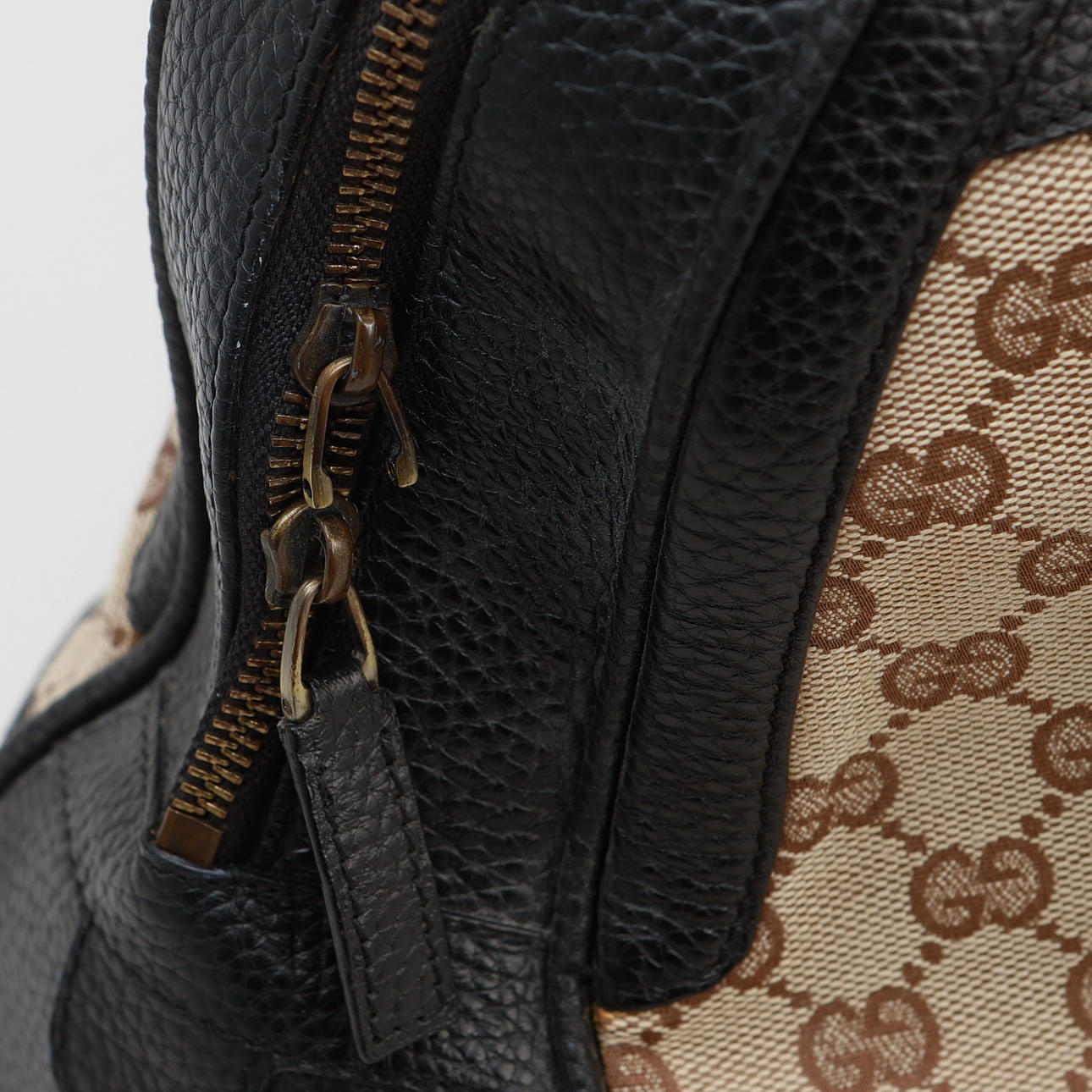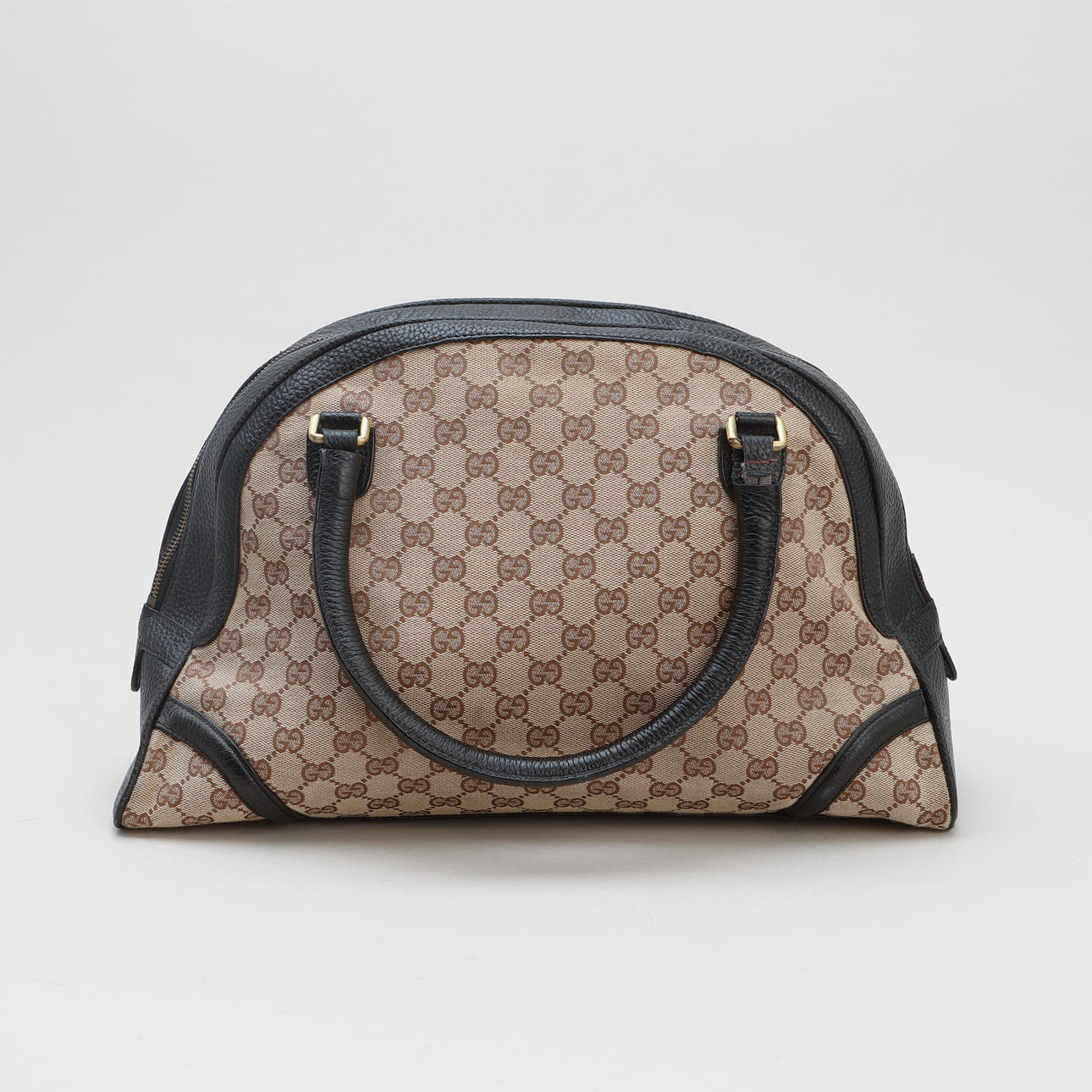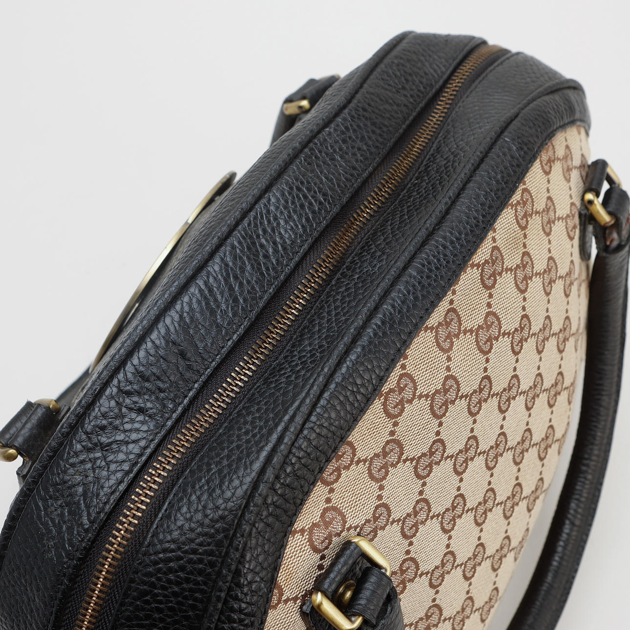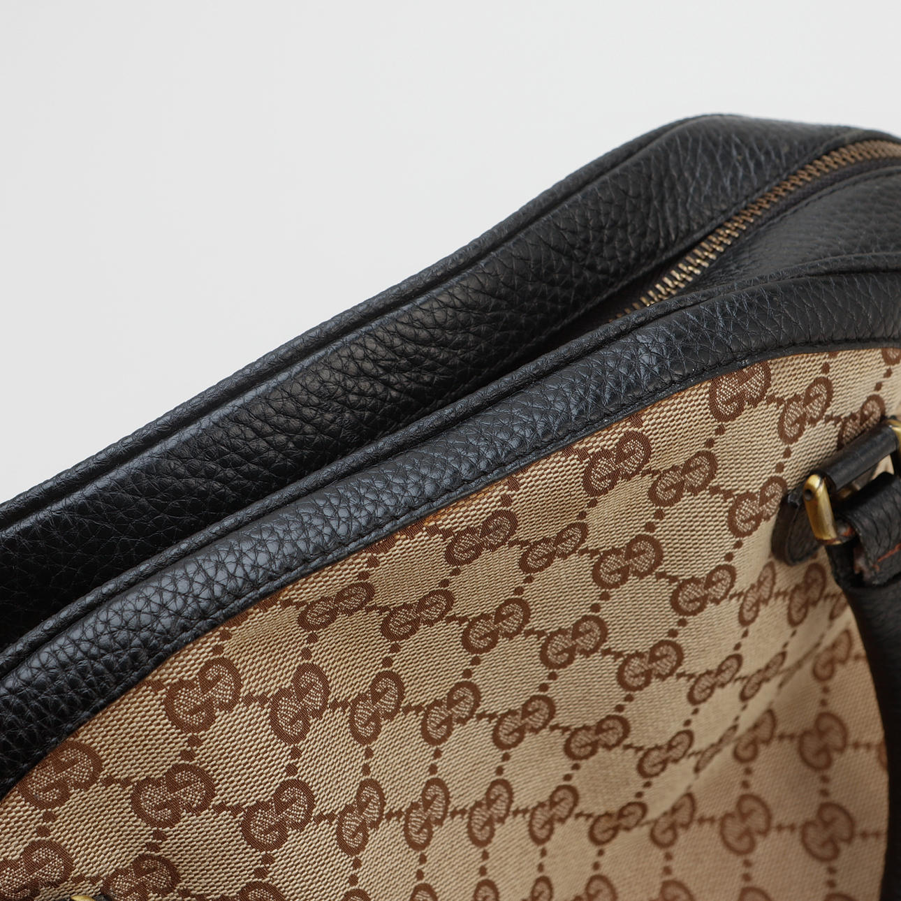 Tasche aus Stoff mit Guccissima-Muster und braunem Leder und Details aus gebürstetem gelbem Metall. Markierte Gucci hergestellt in Italien. Etwa 41 x 26 x 14 cm. 3 Innenfächer, davon 1 mit Reißverschluss.