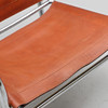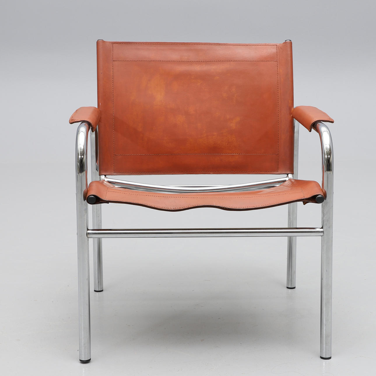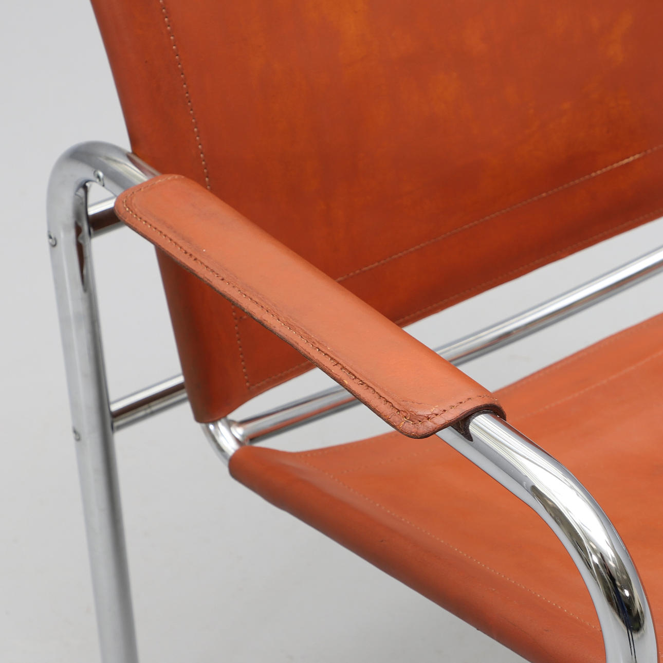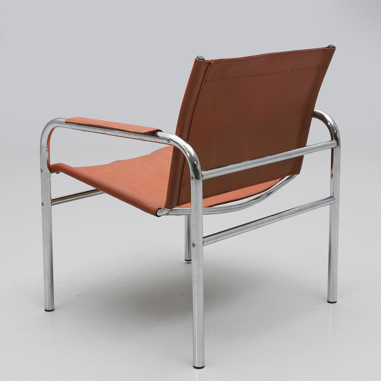 Gestell aus verchromtem Stahlrohr, Sitz und Rücken in rotbraunem Leder. Breite 67, Sitzhöhe ca. 41 cm.
