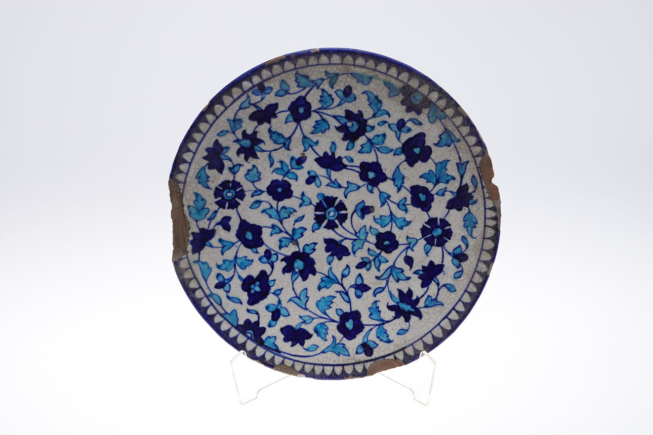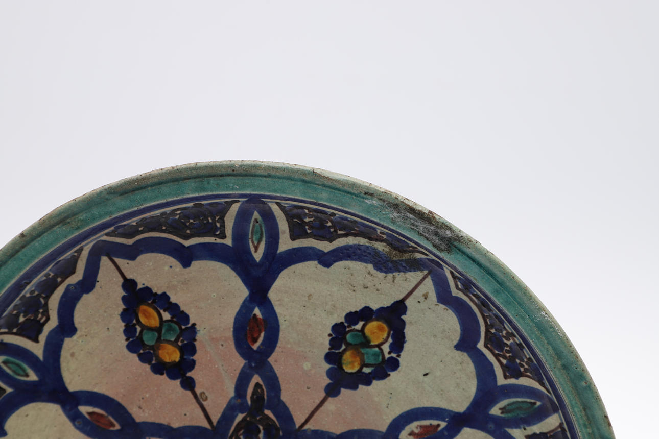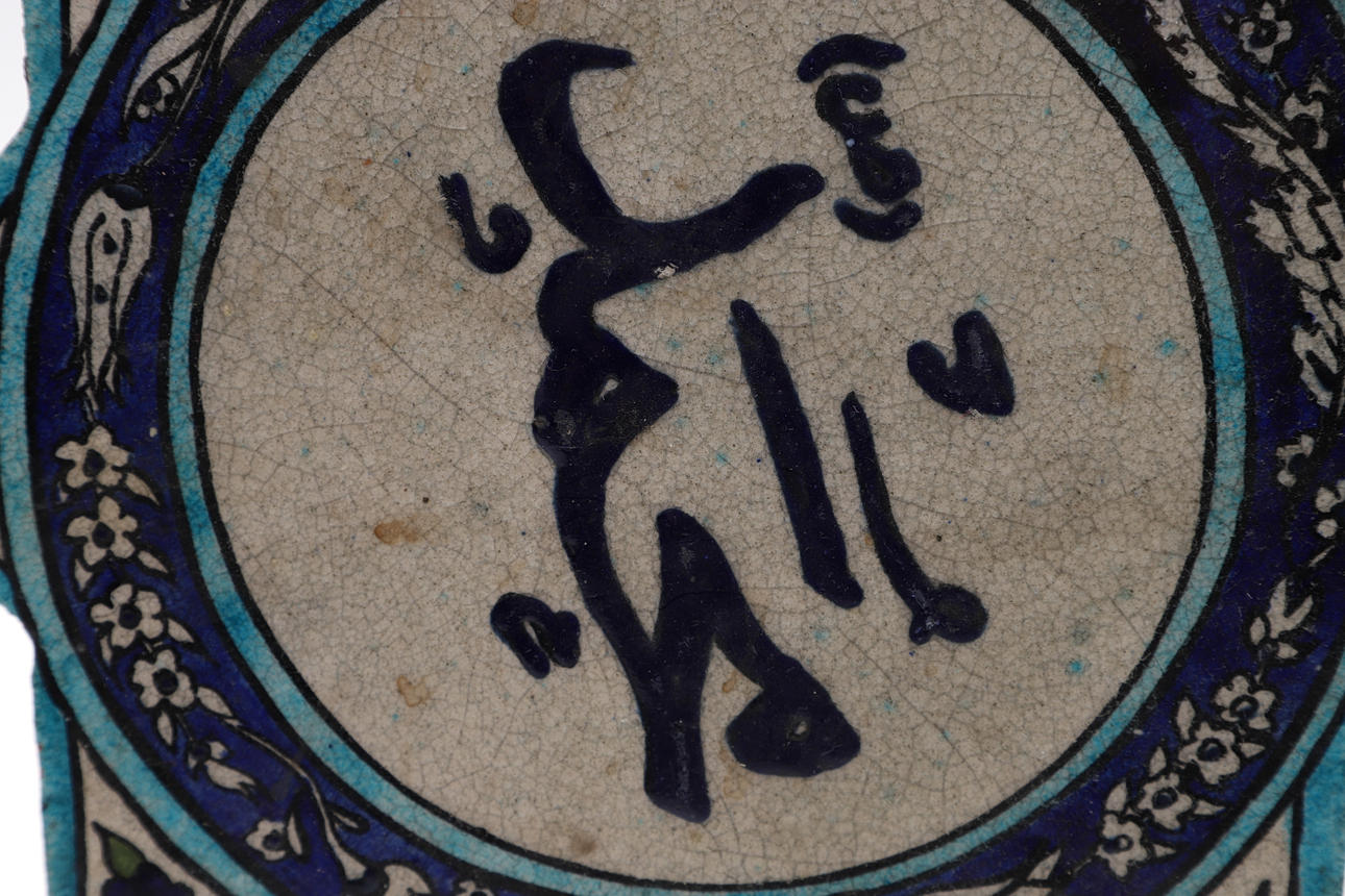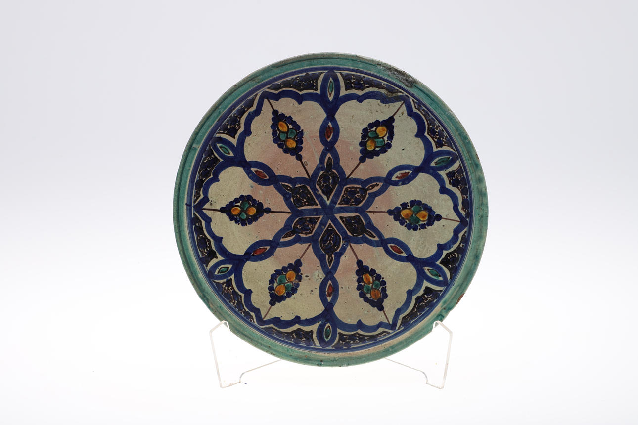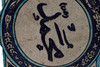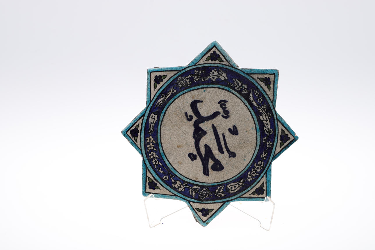 die größte Teller 32 cm Durchmesser und eine sternförmige Kachel mit arabischer Schrift, 28 cm Durchmesser.