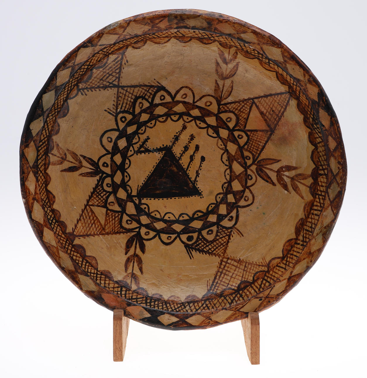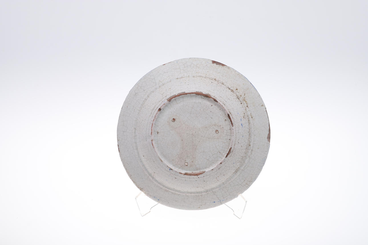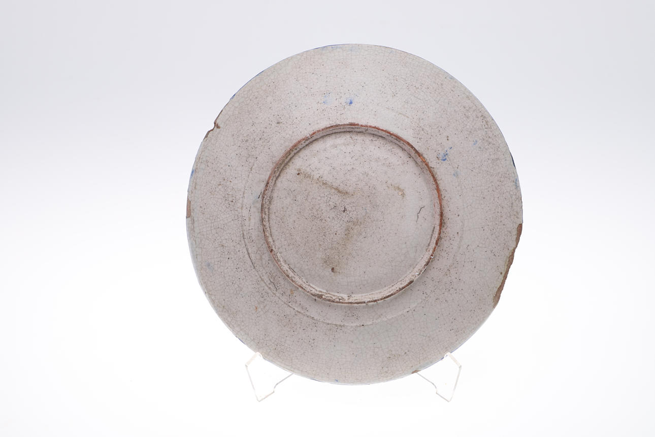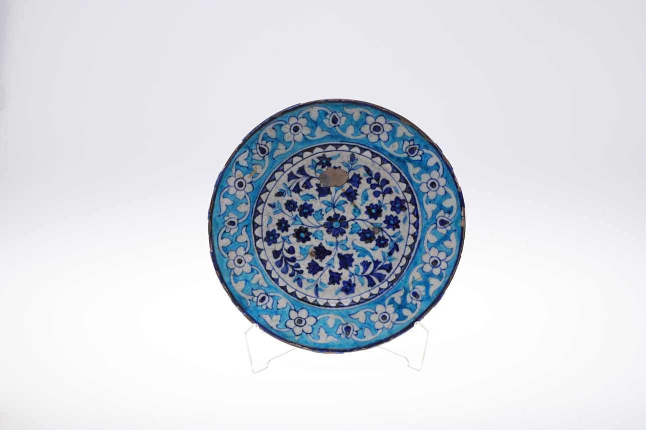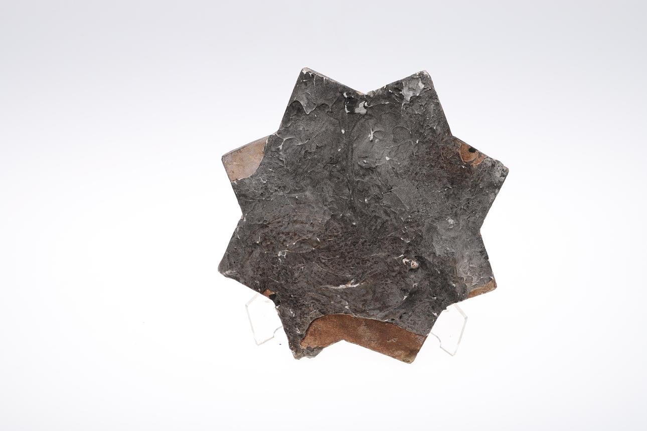 die größte Teller 32 cm Durchmesser und eine sternförmige Kachel mit arabischer Schrift, 28 cm Durchmesser.