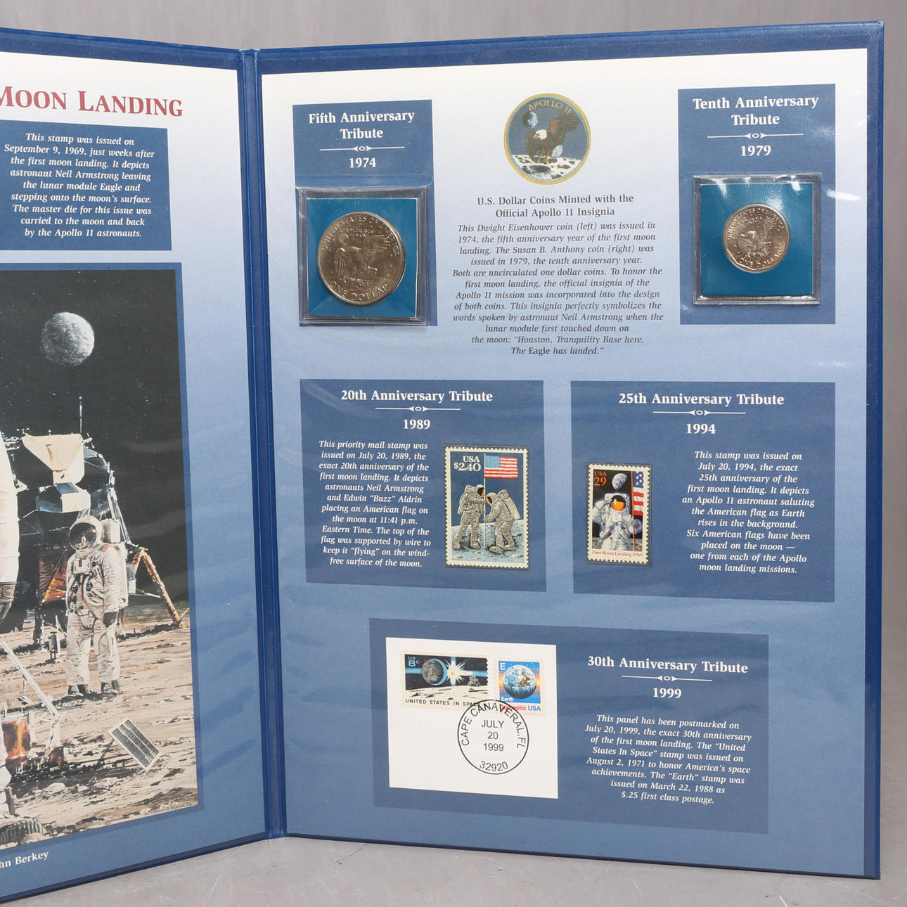 Inklusive Portfolio mit mehreren Münzen und Briefmarken aus verschiedenen Jubiläumsjahren nach der Mondlandung.