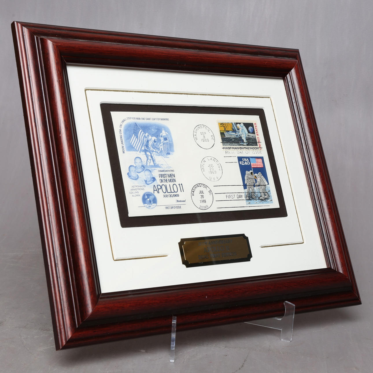 Gerahmter Ersttagsbrief mit 2 Briefmarken und 3 Briefmarken, zwei von 1969 und eine von 1989, 20 Jahre nachdem Apollo 11 auf dem Mond gelandet war.