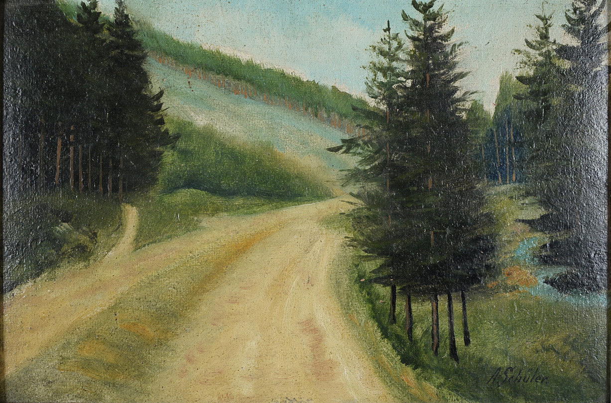 A. SCHÜLER. " Waldweg ". Öl auf Karton.