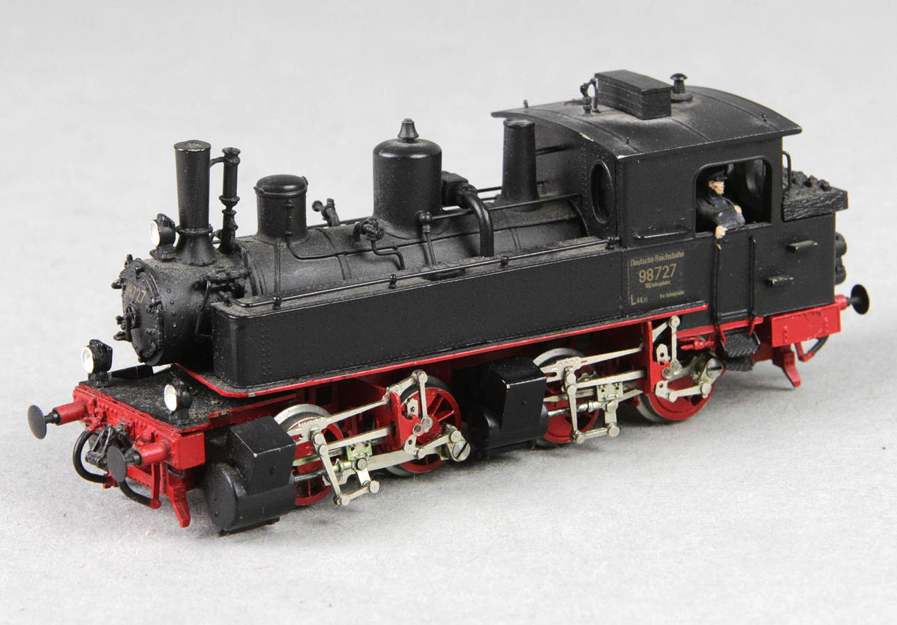 gemarkt M+F sowie Original M+F Model*, Merker und Fischer (Merker&Fischer), doppelachsig mit 2 Eisenbahnfiguren im Fahrerhaus, Deutsche Reichsbahn 98707, Spur H0, L ca. 11,5 cm.