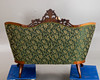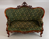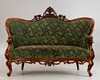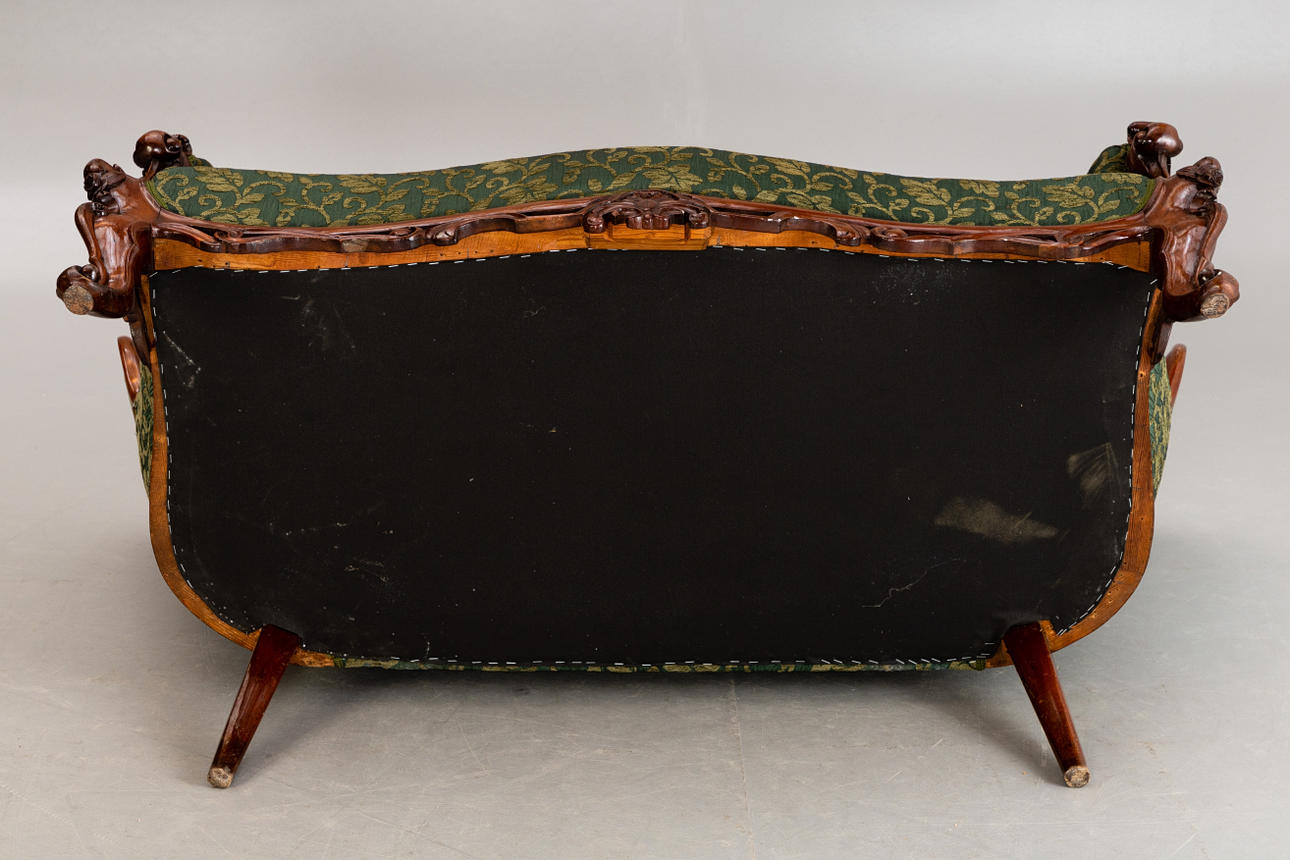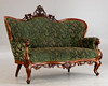 Mahagoni. Geschweifter, profilierter, durchgepolsterter Holzrahmen auf frontseitig volutierten Beinen. Mittig je ein geschnittenes Zierelement, gerahmt von verschlungenen bewegten Streben. Mit Blattranken durchgemusterter, grüner Texilbezug. HxShxBxT: ca. 120 x 47 x 160 x 75 cm.