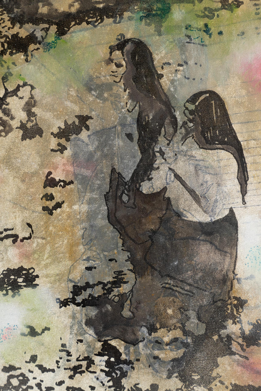 Die Themen der Mensch und Natur entfalten sich in einem langen Beschaffungsprozesses zwischen Abstraktion und Figuration mittels Erinnerungen, Entfremdung und Verfälschung der Motive.